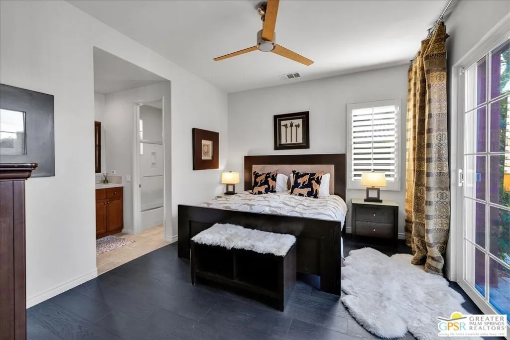 Discover this beautiful Mediterranean-style home located in the sought after lake community of Santo Tomas. Offering 3 bedrooms, 3 bathrooms, and 2,391 square feet of refined living space, this residence is designed for comfort, style, and effortless indoor outdoor living. Step inside to find an inviting floor plan enhanced by high ceilings, abundant natural light, and timeless architectural details. The kitchen, which features granite counters, an island with prep sink, and a Sub Zero refrigerator, flows seamlessly into the spacious dining area. The primary suite features a well-appointed ensuite, including an Alpha smart toilet, soaker tub, and a generous two room walk in closet. Two additional guest bedrooms, one with an en suite, provide flexibility for family, guests, or a home office. Outside, enjoy the beautifully landscaped surroundings and your very own recently updated Pebble Tec pool and spa with incorporated water feature. The multiple outdoor entertaining areas are perfect for large gatherings, or intimate evenings for two in front of the fire pit. Santo Tomas' reasonable HOA fees include gate and ground maintenance, parks, and social events. Of tremendous value is the inclusion of a Mission Hills Country Club Social, Fitness, & Racquet (tennis & pickleball) Membership. Mission Hills is known for it's thriving social environment and it's recently renovated club house and state of the art two story gym! A few of the recent updates include white oak engineered hardwood flooring in the bedrooms, newer HVAC, a Pebble-Tec pool and spa update, wifi / app controlled systems, 220 V wiring in the garage to accommodate an electric car charger, and a retractable exterior awning. Santo Tomas offers a peaceful lake environment while remaining close to world-class golf, dining, shopping, and resort amenities. It is also just a few minutes away from Downtown Palm Springs and all of its offerings. This exceptional home is a true Desert gem. Why not schedule your tour today so you may discover for yourself!