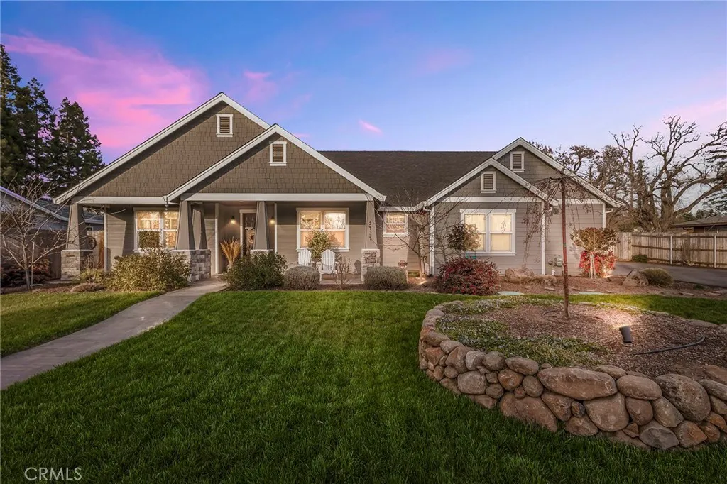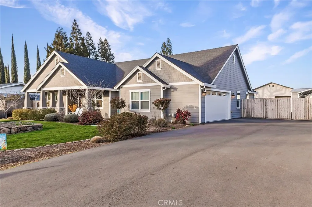 Welcome to a rare opportunity to own a custom-built masterpiece set on a generous half-acre lot. Crafted by its owners with an uncompromising commitment to quality and beauty, this extraordinary residence offers a level of detail simply not found in a standard spec home. From the moment you arrive, lush landscaping and a stamped concrete walkway lead to a grand covered front porch. Step through a stunning Knotty Alder front door into a home featuring smooth-coat drywall, soaring 9-foot solid wood interior doors, and wood-encased windows dressed in custom shades — every inch exudes intentional elegance. The living room stuns with a tray ceiling, crown molding, a gas fireplace with Taj Mahal leathered slab surround, and an impressive 117” x 96” Milgard sliding door that floods the space with natural light. The chef’s kitchen boasts KitchenAid black stainless appliances, a custom hood, pot filler, Oak Ridge shaker cabinets, antique chandeliers over the island, and a spacious 7.5’ x 7’ walk-in pantry. The primary suite features spa-inspired finishes including 24x24 porcelain tile, a soaking tub, tiled step-in shower, and a one-of-a-kind custom vanity with solid surface countertops. Throughout, you’ll find engineered hardwood floors, 5” baseboards, Carrara porcelain tile, Honeywell 60HZ air cooled Generac generator and a whole-house fan. The home is fully ADA-compliant in all hallways, doors, and the bath. Outside, a 27.5’ x 10’ covered patio with recessed lighting is perfect for year-round entertaining. A 20’ x 25’ workshop, 30’ carport, oversized two-car garage, and wide driveway complete this exceptional property. A tankless water heater adds efficiency. This is not just a house — it’s a legacy built with heart and skill. Opportunities like this in Chico are extraordinarily rare.