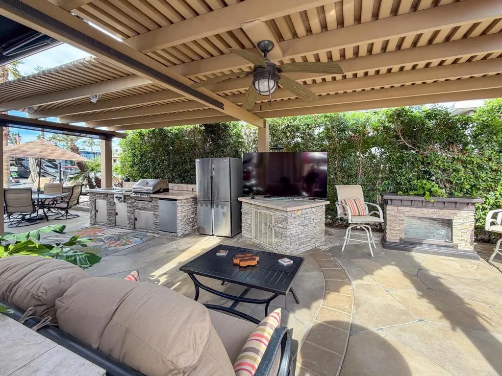 This inviting space centers around an L-shaped pergola with ceiling fan, creating a comfortable outdoor living area. Manual drop-down shades provide excellent shade control, added privacy, and the ability to capture warmth when desired. The coated RV pad and pavers that widen the parking area enhance both appearance and functionality.The medium-sized outdoor kitchen features a natural rock surface, stainless appliances, sink, gas two-burner cooktop, built-in BBQ, under-counter refrigerator, abundant storage, and a full-size freestanding refrigerator -- offering everything you need for easy entertaining. A built-in storage and counter area that matches the kitchen provides the perfect setup for a TV or outdoor entertainment space.Furnishings include a square dining table with umbrella and four swivel chairs, an additional square table with two cushioned swivel chairs, two more swivel chairs, a loveseat with coffee table, and a freestanding fireplace for cozy evenings. Two pieces of exercise equipment are also included.Walking distance to a satellite pool and laundry facilities, Lot 74 offers comfort, convenience, and a peaceful setting within the resort -- a wonderful opportunity to enjoy the season in your own private retreat.Outdoor Resort Indio is a class A only motorcoach resort.
