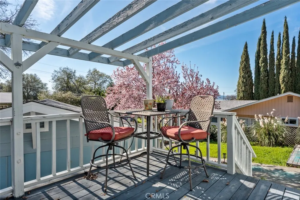 Spacious and updated 2,328 sq ft home set on a generous 8,276 sq ft lot on a quiet street, featuring peek-a-boo lake views and a versatile detached spa/workout room. Inside, enjoy a sunken living room with exposed wood beam ceilings, simulated wood laminate flooring, and dual-pane windows that bring in abundant natural light. The upgraded kitchen offers quartz countertops, soft-close cabinetry, and tile flooring, while the dining room opens to a deck perfect for relaxing or entertaining with views. Large bedrooms provide comfortable living, with two of the three offering walk-in closets. The primary suite includes an attached office/storage space and an en-suite bath with dual sinks, marble countertops, a soaking tub, and tile surround. The second bathroom features classic subway tile, a tub/shower combo, and marble vanity. Additional highlights include an inside laundry room, central heating and air, a detached two-car garage, and extra parking. Outdoor deck and patio areas make it easy to enjoy the peaceful setting. A wonderful place to call home. Currently has an assumable VA loan with amazing terms.