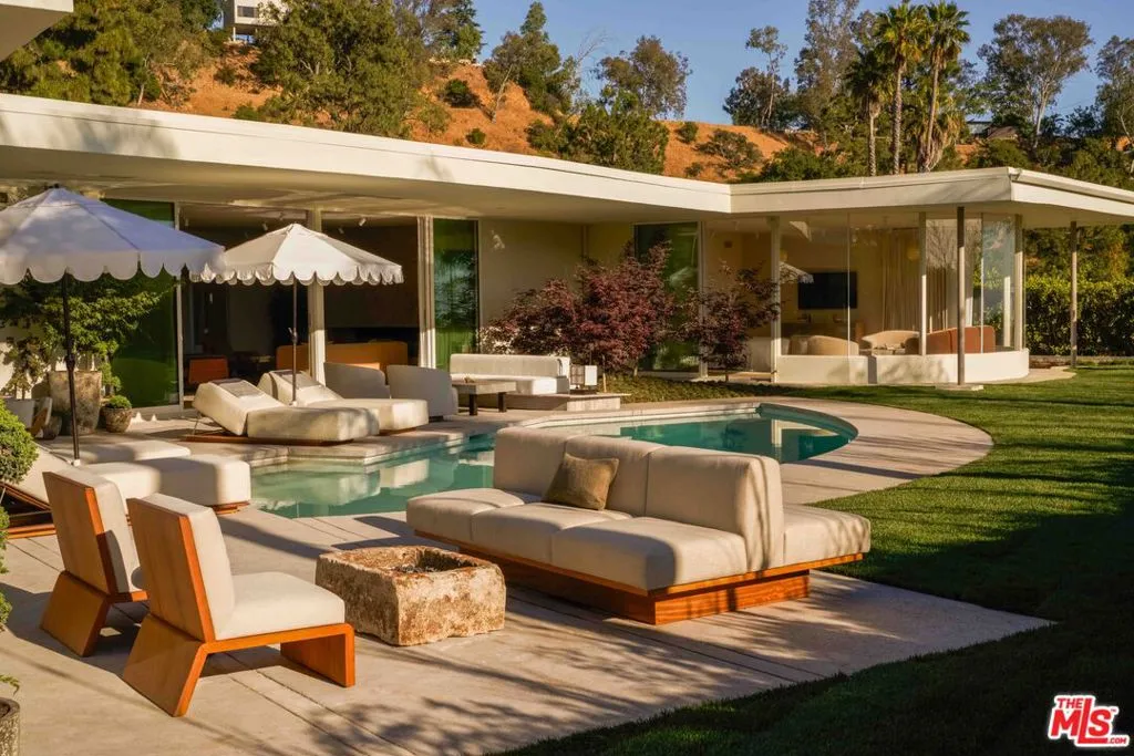 One of the finest mid-century architectural homes in Trousdale, OSKLO House sits on a flat half-acre lot with sweeping views of West LA. Designed by Benton & Parks AIA in 1966 and completely reimagined by OSKLO, this approx. 6,200 SF estate blends iconic design with modern luxury. A dramatic courtyard with a sculptural fountain sets the tone for the fully furnished, turnkey residence. Inside, the living room features an oversized fireplace and floor-to-ceiling windows, creating a striking introduction to the home. Custom OSKLO furnishings, museum-quality antiquities, and curated vintage pieces beautifully complement the rich materials and finishes throughout. No expense was spared. The kitchen embodies classic Beverly Hills living, complete with a breakfast nook, butler's pantry, and a wall of windows opening to the garden. The primary suite, showcasing nearly $1 million in stonework, offers wraparound windows overlooking the backyard and city lights beyond. A long hallway above a Japanese-inspired atrium leads to three ensuite bedrooms, with an additional ensuite near the kitchen and a pool bath by the outdoor cabana ideal for hosting.Outside, the angular pool pavilion includes multiple lounge areas, a swimming pool, fire pit, and outdoor bar, capturing the essence of Trousdale's signature indoor-outdoor lifestyle.