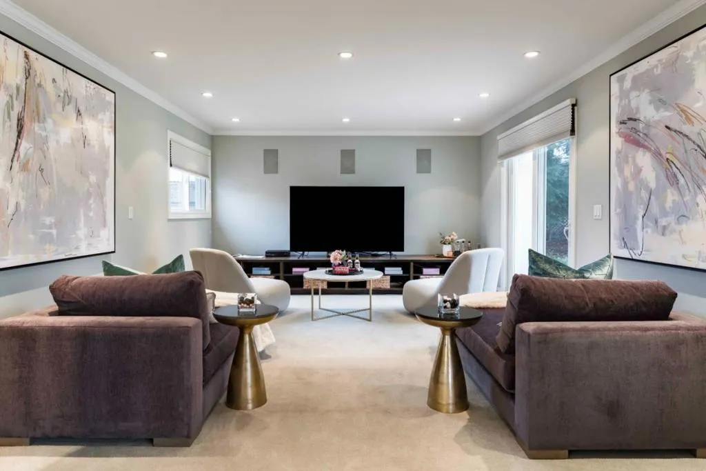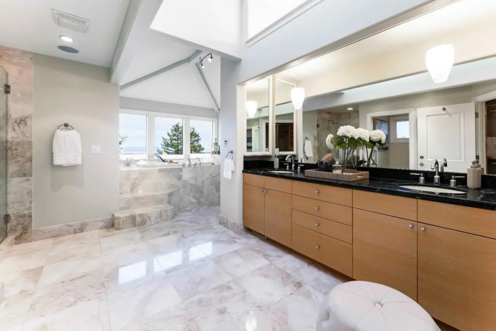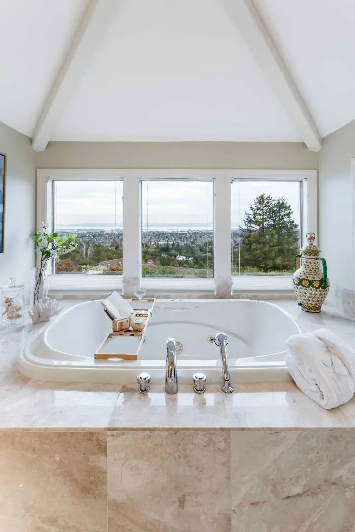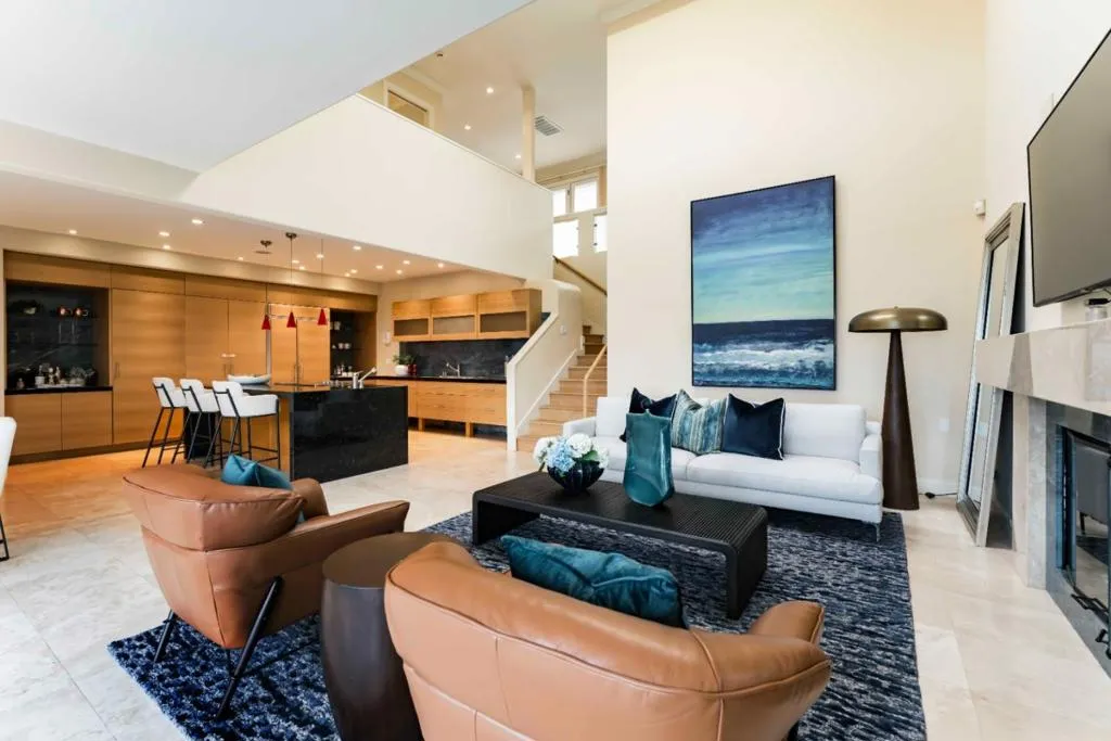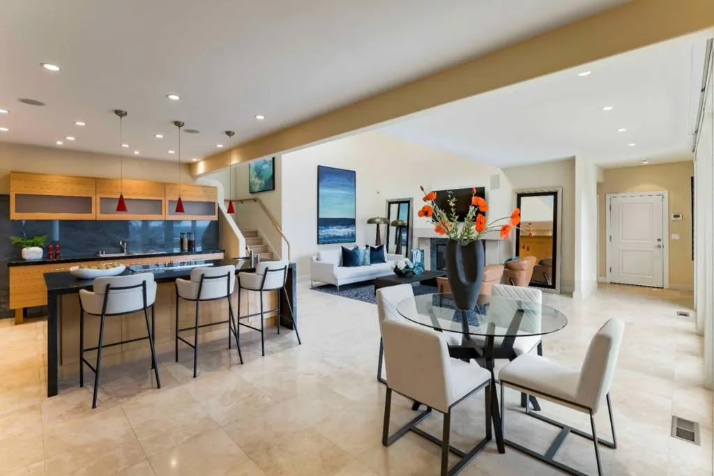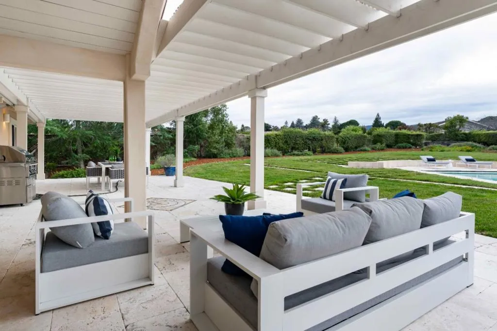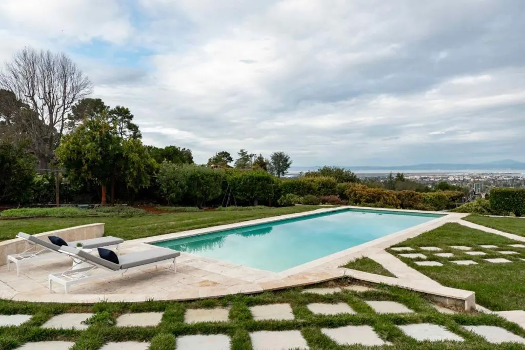 Sweeping, unobstructed San Francisco Bay views define this contemporary estate set on more than an acre in Woodside Hills, with dramatic scenery enjoyed from nearly every room. Walls of glass, soaring ceilings, and refined finishes including marble, granite, and travertine floors create a striking yet warm aesthetic throughout approximately 4,800 square feet across two levels. The expansive kitchen and family room anchor the main level, complemented by gracious formal living and dining spaces that provide multiple areas for entertaining. The upper level offers additional gathering space including a media room, along with four bedroom suites highlighted by a luxurious primary retreat with a spa-inspired bath. Outside, the grounds feature a pool and pergola-covered terrace, all oriented toward the views. Climate control ensures year-round comfort, while a gated setting offers privacy close to parks, nature preserves, and convenient commute options.