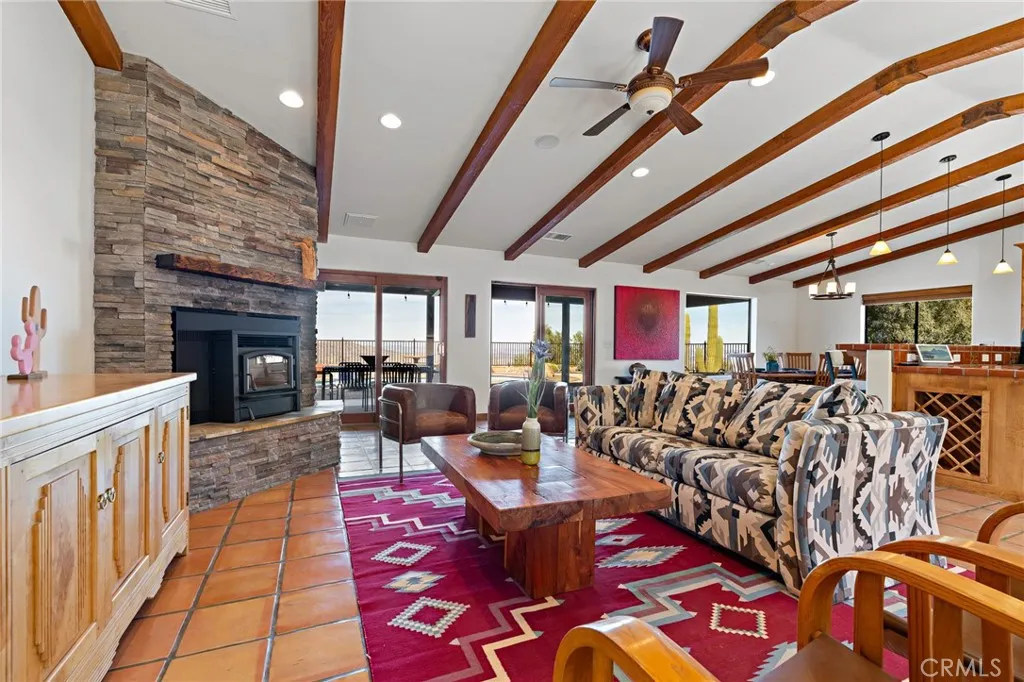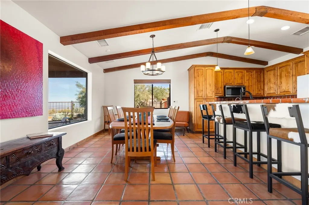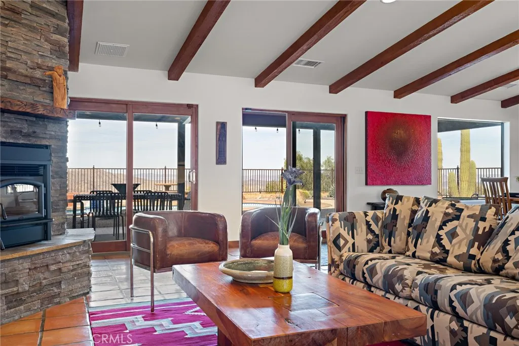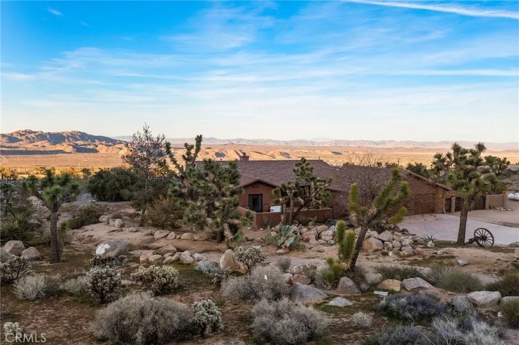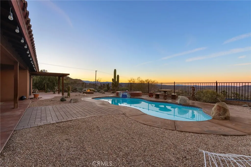 Welcome to a true desert masterpiece in the highly coveted Upper Friendly Hills of Joshua Tree. This stunning 2007 Santa Fe-style home offers 3 bedrooms, 2 bathrooms, and 1,735 square feet of thoughtfully designed living space, perfectly situated on 2.24 acres of pristine High Desert landscape. From the moment you arrive, mature landscaping and iconic Joshua Trees frame the property, while saguaro cacti and curated garden spaces create a setting that feels both intentional and inspiring. Inside, Spanish tile flows throughout the home, complemented by exposed beams, a warm fireplace in the living room, and an effortless feng shui that makes the space feel balanced and inviting. The kitchen offers generous prep space and seamless indoor dining and entertaining areas designed for gathering. The layout is ideal, with two guest bedrooms positioned toward the front of the home, while the primary suite enjoys privacy and direct access to the backyard oasis. Step outside to a breathtaking pool and hot tub overlooking the valley—arguably some of the best views in all of Joshua Tree. Whether you're entertaining on the expansive front porch, hosting sunset dinners out back, or relaxing under the desert sky, every angle of this property is designed to impress. The three-car garage offers flexibility, with the two-car portion currently converted into an art or music studio, easily convertible back if desired. Paid solar adds efficiency and long-term value. Located just minutes from the West Entrance of Joshua Tree National Park, this is more than a home—it’s a classical work of art set against one of the most iconic landscapes in the world.