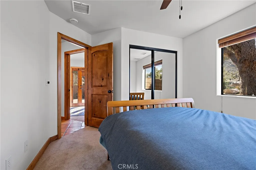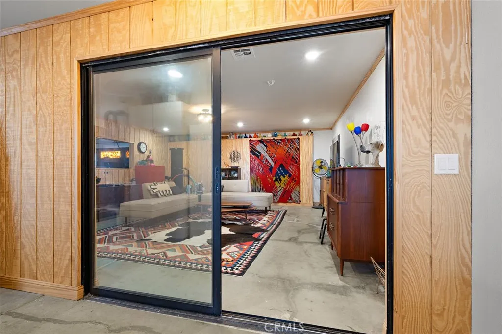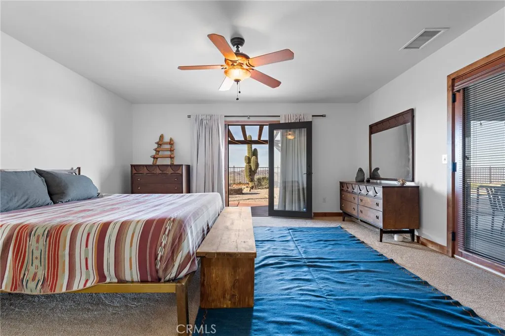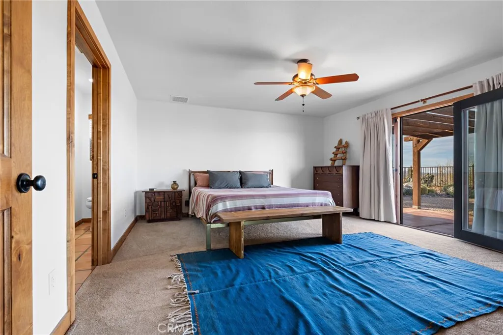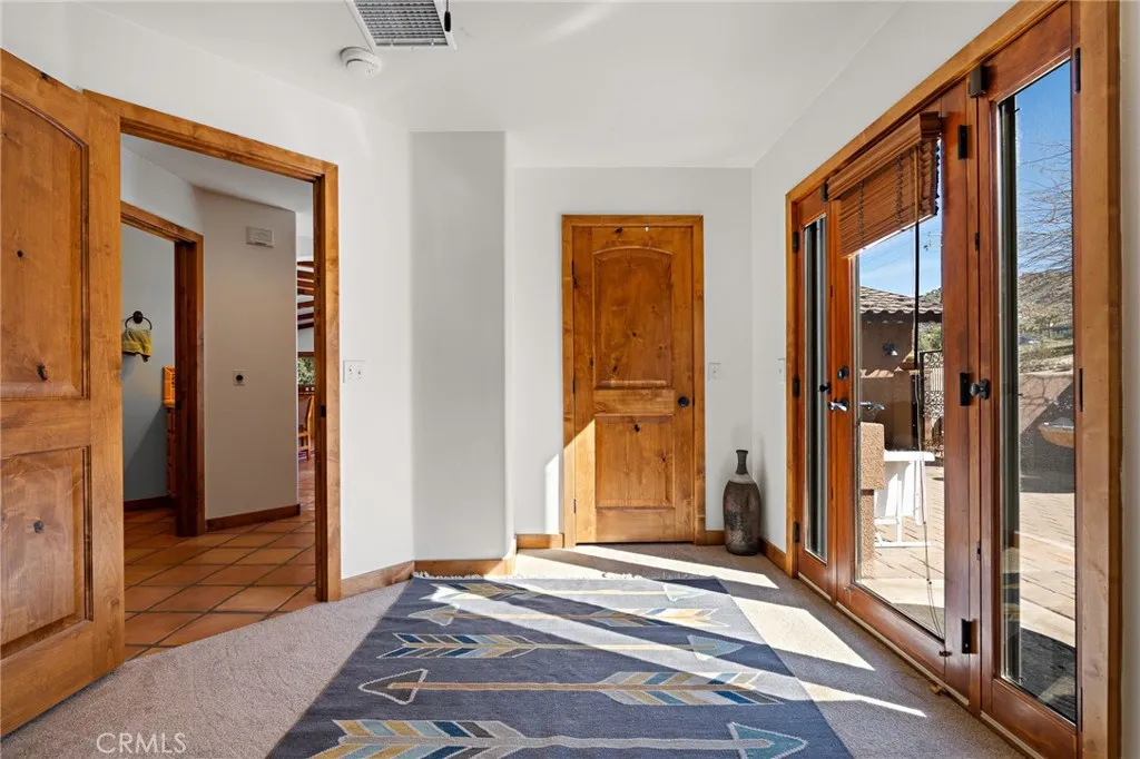 Welcome to a true desert masterpiece in the highly coveted Upper Friendly Hills of Joshua Tree. This stunning 2007 Santa Fe-style home offers 3 bedrooms, 2 bathrooms, and 1,735 square feet of thoughtfully designed living space, perfectly situated on 2.24 acres of pristine High Desert landscape. From the moment you arrive, mature landscaping and iconic Joshua Trees frame the property, while saguaro cacti and curated garden spaces create a setting that feels both intentional and inspiring. Inside, Spanish tile flows throughout the home, complemented by exposed beams, a warm fireplace in the living room, and an effortless feng shui that makes the space feel balanced and inviting. The kitchen offers generous prep space and seamless indoor dining and entertaining areas designed for gathering. The layout is ideal, with two guest bedrooms positioned toward the front of the home, while the primary suite enjoys privacy and direct access to the backyard oasis. Step outside to a breathtaking pool and hot tub overlooking the valley—arguably some of the best views in all of Joshua Tree. Whether you're entertaining on the expansive front porch, hosting sunset dinners out back, or relaxing under the desert sky, every angle of this property is designed to impress. The three-car garage offers flexibility, with the two-car portion currently converted into an art or music studio, easily convertible back if desired. Paid solar adds efficiency and long-term value. Located just minutes from the West Entrance of Joshua Tree National Park, this is more than a home—it’s a classical work of art set against one of the most iconic landscapes in the world.