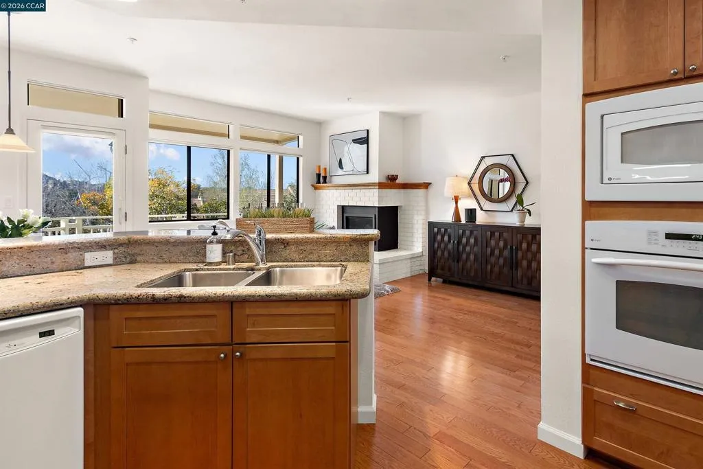 The ever popular (and rarely available!) Montrose model offers nearly 1600 SF of elegant living spaces designed to fit today's lifestyle needs! Located in Rossmoor Greens, this lower level condo has been tastefully updated throughout, and features a custom kitchen remodel, hardwood floors and plantation shutters. The comfortable floorplan flows seamlessly from room to room, and dramatic high ceilings and clerestory windows keep the manor light and bright. The stylish open kitchen adjoins a cozy breakfast nook and a family room with a gas fireplace. Luxuriate in the oversized primary bedroom suite and spacious ensuite bathroom. Best of all, enjoy expansive hillside views from the generously sized balcony - perfect for enjoying sunsets! The manor comes with a spacious laundry room plus a detached garage with a loft for additional storage. Meticulously maintained, this manor is move-in ready and just waiting for you! Welcome to Rossmoor, Northern California's premier 55+ community!