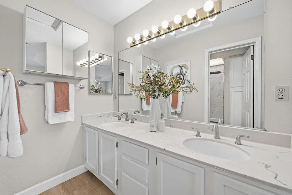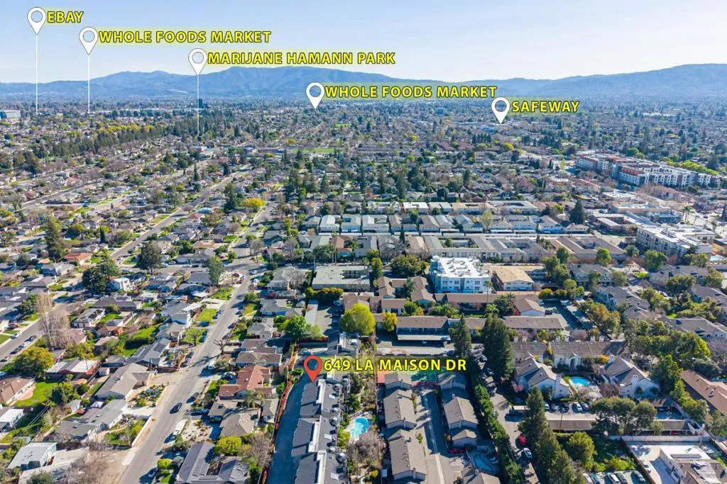 Welcome to this charming home located in San Jose, offering a comfortable living space of 1104 sq ft. This residence features two spacious bedrooms, including a primary suite/retreat, and two full bathrooms equipped with shower over tub, double sinks, and stall shower. The kitchen is well-appointed, boasting modern appliances such as a dishwasher, microwave, oven range - electric, and refrigerator, all complemented by a skylight for natural illumination. Notable amenities include vaulted and high ceilings, further enhanced by skylights, contributing to an airy atmosphere. The flooring throughout the home are hard flooring. Cozy up on cooler evenings with the gas fireplace. Central AC and forced air heating ensure comfort year-round. Laundry is conveniently located inside, equipped with washer and dryer. The property also features a fenced in-ground pool and community facility pool. The house is situated within the Campbell Union Elementary School District.