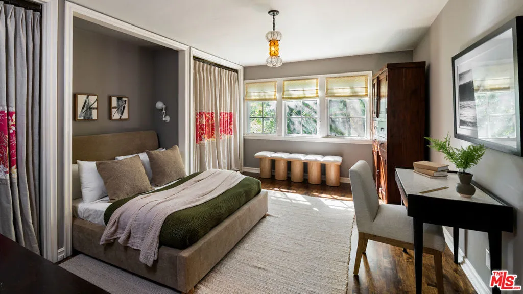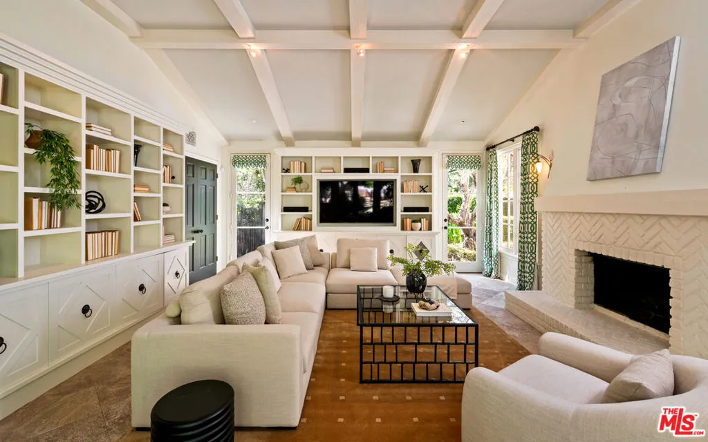 Located at the end of a private drive and set behind gates, this stately 5-bedroom, 6-bath traditional home rests on almost an acre of mostly flat and useable parklike land. Exuding charm and timeless sophistication, every room enjoys a connection to the outdoors and beautiful vistas. The main level opens with a formal living room beneath vaulted, wood-beamed ceilings, flowing into an elegant dining room complete with a fireplace framed by a detailed custom mantel and wet bar. A warm and inviting family room offers the perfect setting for relaxed gatherings. The gourmet kitchen features a center island, professional-grade appliances, and a breakfast nook with French doors opening to the gardens. The grounds, designed by acclaimed landscape architect Garrett Carlson, are a private sanctuary. Lush plantings surround a sparkling pool and spa, a basketball court, and a detached studio ideal for creative pursuits or a guest hideaway. Upstairs, the impressive primary suite boasts treetop views, a walk-in closet, and a spa-like bath with a steam shower, double vanities and soaking tub. Four additional bedrooms, a gym, and a study complete the home. Conveniently positioned near top-rated schools, world-class dining, and cultural landmarks including the iconic Getty Center this residence captures the essence of the California lifestyle.