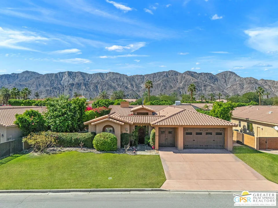 ULTRA PRIVATE desert retreat in Desert Club Estates at La Quinta where poolside living and Santa Rosa mountain views set the tone. A wonderful approach sets the stage as a magnificent gate opens to a dramatic arrival at the front door. 4 bedrooms and 4.5 baths including a detached casita across approximately 3,441 square feet. Outdoor living shines with a series of inviting conversation areas surrounding the pool and spa, plus a built in BBQ ready for easy entertaining. Inside, a great floor plan and effortless indoor outdoor flow define the living spaces. Formal living and family rooms share a striking double sided fireplace, creating two inviting gathering areas. A wet bar enhances the entertaining vibe while the family room also features a built in entertainment center. The island centered kitchen offers abundant cabinet and counter space plus a breakfast area overlooking the pool and patio. A spacious laundry room with utility sink adds everyday convenience. The Primary Suite delivers comfort and scale with a walk in closet featuring built ins and a private bath with separated vanities, large jetted tub, and separate glass enclosed shower. Guest Bedrooms 2 and 3 are positioned along a central hall while Bedroom 4 is the detached casita. All four bedrooms are ensuite, offering excellent separation of spaces and privacy for residents and guests alike. Three car garage with 10 foot roll up doors. Whether full time or seasonal, this residence offers the best of La Quinta living in a peaceful and private setting just minutes from golf, tennis, hiking, and the charm of Old Town La Quinta.