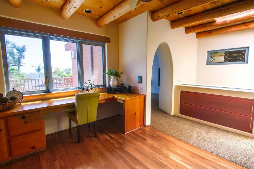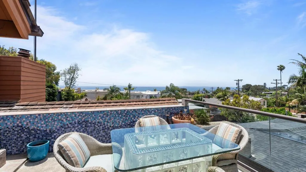 Unfurnished (can be Furnished! if needed ) West of I-5 with ocean views! Pass through the dramatic mosaic entrance into a private courtyard, continue through a wall of French Doors to this masterfully designed custom home. The formal dining room has a kiva fireplace and buter's pantry. Take the nautical spiral staircase to the top deck with a kitchen and entertainment area and enjoy panoramic view of the ocean. 4 Bedroom , 4 bath and 2 offices, Garage plus one outside parking space. . The master bedroom exudes natura light streaming from both sides of the room and overooks the privatedoors leading to the wrap-around deck facing the West into the Pacific Ocean. ROOFTOP is entertainers haven!!!