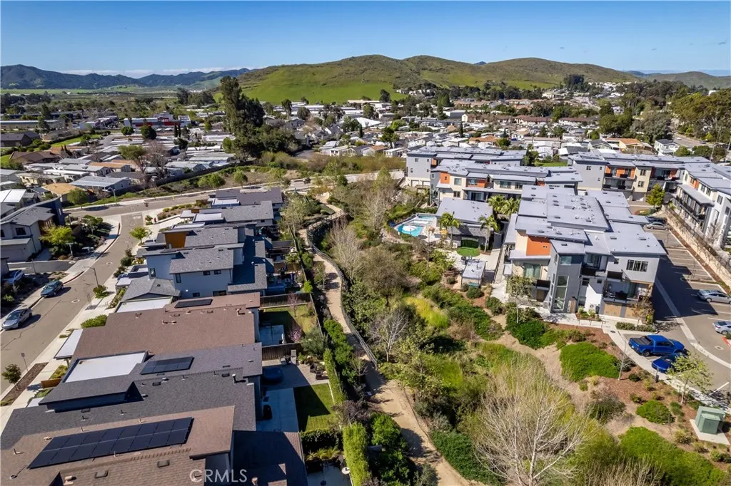 Contemporary mid-century modern inspired Noveno residence. Set amongst the backdrop of Islay Hill, the ninth peak of the iconic chain of Nine Sisters, this home is ideally situated to enjoy the best of the Central Coast lifestyle. Providing convenient access to shopping, dining, and the Thursday evening Farmers’ Market in downtown San Luis Obispo, scenic hiking and biking trails, and beautiful coastal destinations, this property is also just minutes from SLO County Regional Airport. Offering approximately 1,979 square feet of living space, the home includes three bedrooms, three bathrooms, and a versatile loft designed to accommodate today’s evolving needs. The inviting main level features luxury vinyl plank flooring, smooth-finish interior walls, and abundant natural light throughout the spaces. The living room is a comfortable space to unwind after a day at the beach or mountain biking. The adjacent dining room is highlighted by a woven wicker hanging fixture and an 8-foot sliding glass door with plantation shutters that opens to a private outdoor setting featuring a concrete and paver patio with synthetic turf, ideal for entertaining. The thoughtfully designed kitchen blends style and functionality with quartz countertops, a subway tile backsplash, shaker-style white cabinetry, and natural fiber pendant lights. A GE stainless steel appliance package including refrigerator, microwave, dishwasher, and gas range complements the space, while a walk-in pantry with glass door and breakfast bar for casual dining add convenience. The second level offers three bedrooms along with a flexible loft that can easily serve as a home office, media room, or reading retreat. The primary suite features a walk-in closet with California Closet organizers and mirrored door, along with a luxe bathroom including a dual-sink vanity with quartz countertop, walk-in shower with tiled surround, and a private water closet. Two secondary bedrooms share a full bath with dual-sink vanity, quartz countertops, tile flooring, and a tub/shower. A conveniently located laundry room includes storage cabinetry and an included LG washer/dryer. Additional highlights include a two-car garage plus a dedicated parking space, covered front porch, and Rheem tankless water heater. Residents of the Noveno community enjoy thoughtfully designed neighborhood amenities including community parkways, walking and bike paths, parks, and shared gathering spaces that encourage connection and outdoor living.