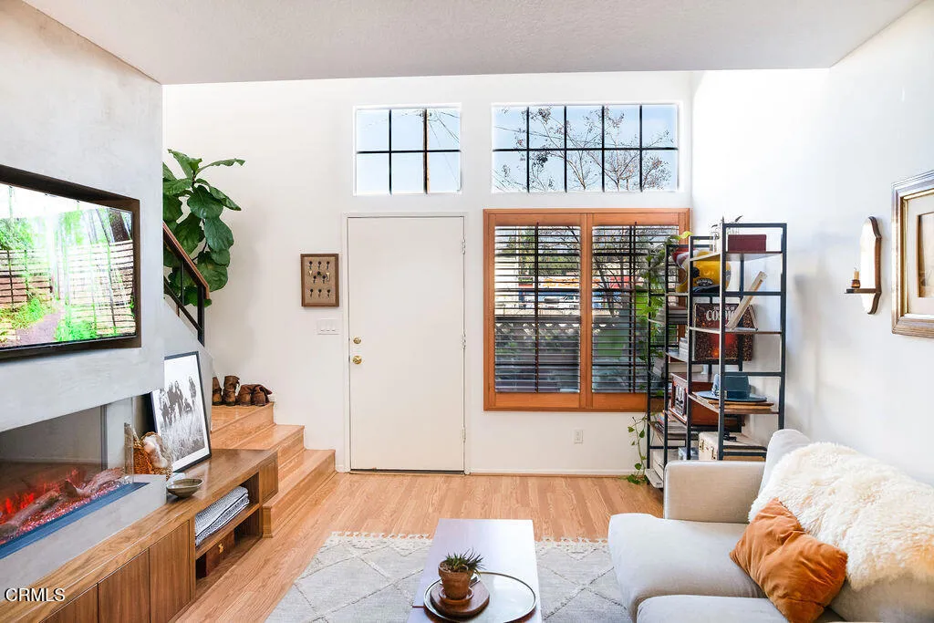Welcome to this beautifully updated townhouse tucked within a charming 15-unit complex in desirable East Pasadena. Enjoy your private patio deck entrance--an ideal spot for morning coffee, bird watching, or relaxing with friends. Inside, the open loft-style floor plan is highlighted by dramatic 20-foot ceilings that fill the home with natural light and frame mountain views through north-facing windows. The inviting living room features a built-in electric fireplace, adding warmth and charm to the space. The kitchen is both stylish and functional, offering quartz countertops, a breakfast bar, tile flooring, and newer appliances--perfect for everyday living. Upstairs, the spacious loft bedroom provides a peaceful retreat with a walk-in closet and full bathroom. Additional highlights include an attached single-car garage with washer and dryer, central air and heat, an energy-efficient roof with a skylight and a storage closet on the patio. Conveniently located near Pasadena City College and the Metro this light-filled home offers comfort, convenience, and easy Pasadena living.