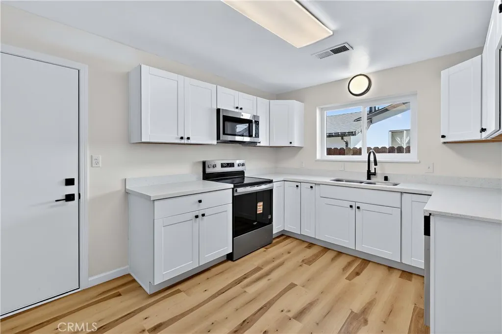 Darling 3 bedroom 2 bath nestled on an oversized corner lot. This turnkey home has been completely remodeled with a new kitchen, flooring, baths, windows and a new roof. The entry leads to a great room with a cozy fireplace, seperate dining area and an attractive and functional kitchen. Down the hall are 2 bedrooms and a master bedroom and bath and a guest bath. The windows have been replaced with dual pane windows. The roof is also new. Out the sliding glass door off the great room is a covered patio for relaxing. The yard is spacious and the fence is new. This home is ready for a buyer and will not last.