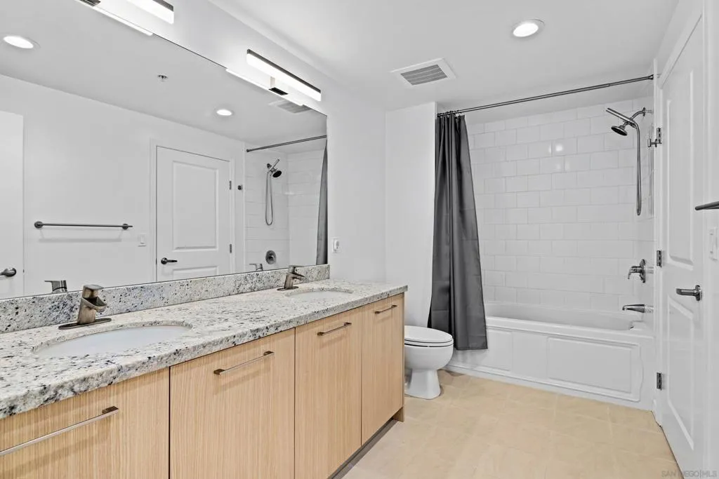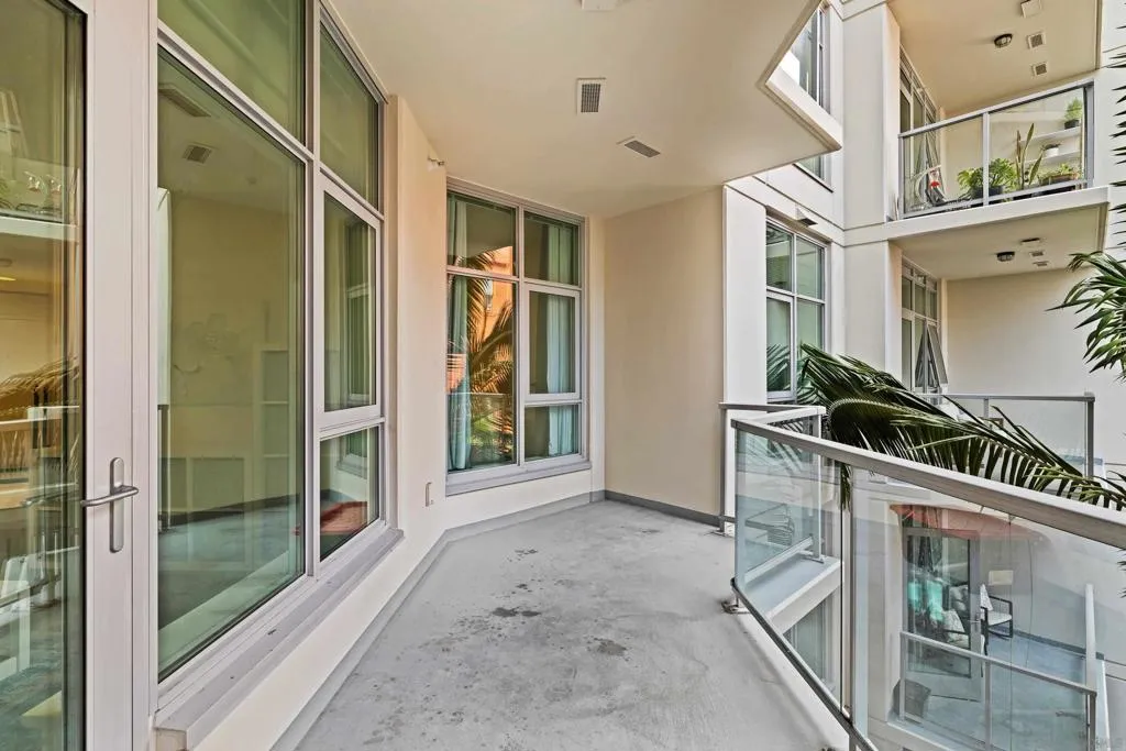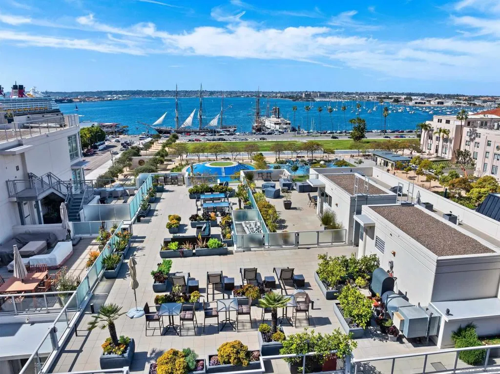 Welcome to Breeza, one of the most desirable residences in the Downtown's Little Italy neighborhood. This is one of only six oversized one-bedroom homes in the entire community—making it a truly rare opportunity and arguably one of the finest one-bedroom residences in the neighborhood. This beautifully maintained home showcases pride of ownership throughout and features a bright open-concept floor plan designed for comfortable living and effortless entertaining. The chef-inspired kitchen is centered around a large granite island with breakfast bar, complemented by stainless steel appliances, abundant cabinetry, and generous counter space. Soaring 10-foot ceilings in both the living room and bedroom enhance the sense of space, while beautiful wood flooring and large windows create a light and inviting atmosphere. The spacious bedroom offers direct access to the well-appointed bathroom with dual vanities, creating a convenient and functional layout. Step outside to your private oversized balcony, perfectly positioned among mature whispering palms overlooking Breeza’s award-winning courtyard—providing a peaceful and private retreat rarely found in urban living. Additional highlights include P-1 parking, new plumbing hardware, new washer and dryer, and updated lighting. Ideally located at the southwest edge of Little Italy and just one block from the waterfront, this home offers one of downtown San Diego’s most walkable lifestyles, moments from the scenic San Diego Bay and the beautiful Waterfront Park. Residents of Breeza enjoy a welcoming community atmosphere and resort-style amenities, including a heated pool and spa, fully equipped fitness center, community lounge, business center, Wi-Fi in common areas, on-site professional management, and a spectacular 8th-floor rooftop terrace with unobstructed views of the bay, sunsets, the historic Star of India, and the downtown skyline. Just steps from Little Italy’s celebrated restaurants, cafés, and the renowned weekly farmers market, and moments from Waterfront Park featuring playgrounds, open green space, pickleball and basketball courts, and a dog park. A rare and exceptional opportunity in one of downtown San Diego’s most sought-after communities—priced to sell.