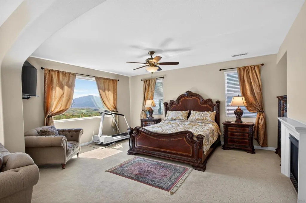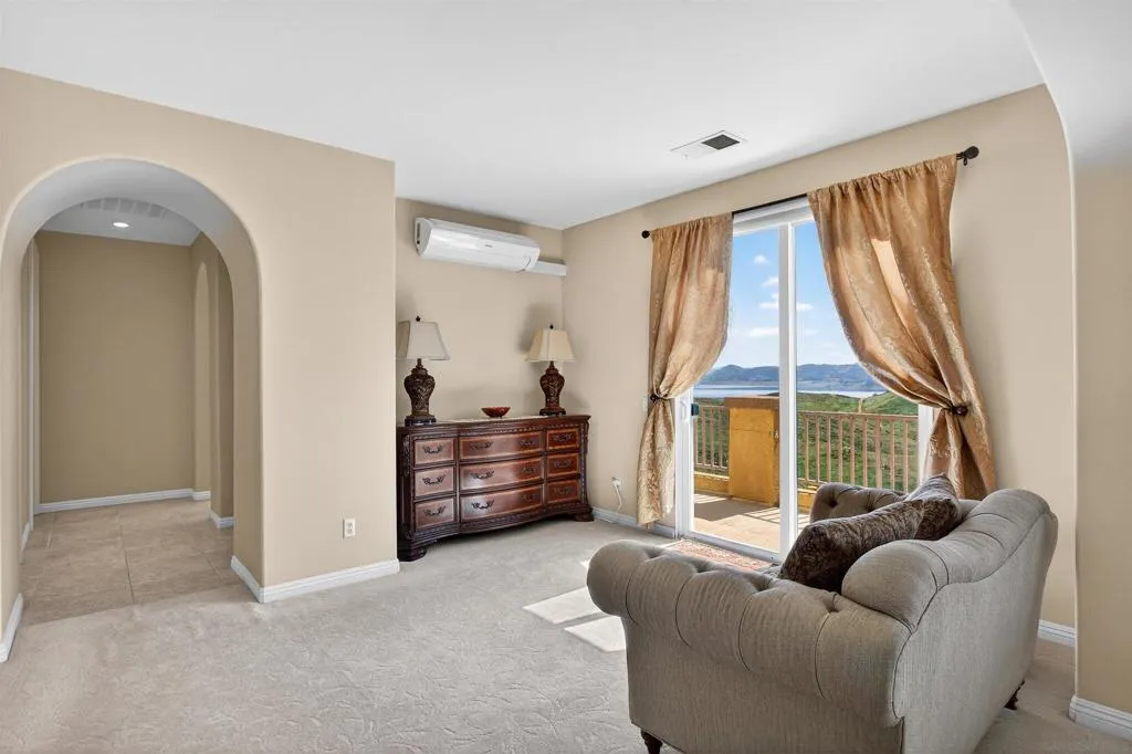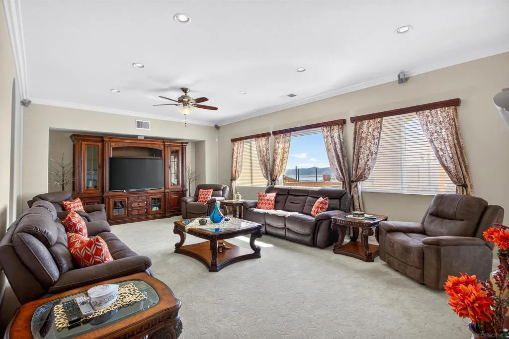 Perched on a premium half-acre lot in the highly desirable Lake Hills community, Lake Mathews view estate offers approximately 4,576 square feet of refined living. The residence showcases expansive interiors highlighted by soaring ceilings, abundant natural light, and multiple fireplaces that create warmth and architectural drama. The spacious chef’s kitchen with granite countertops and rich cabinetry flows seamlessly into generous living and family rooms designed for entertaining. A luxurious primary suite features a private retreat area and balcony perfectly positioned to capture sweeping panoramic views of rolling hills and the lake. Two walk in closets, spa tub, large shower, makeup table and separate sinks. Additional highlights include travertine flooring, loft with Billiard table, central vacuum system, and a 3-car tandem garage with storage shelves, EV charger with a Tesla Battery, 38 (owned) solar panels means no electrical bills, zoned A/C units (installed a year ago), home intercom communication system, smart home features include temperature control, cameras and security. 4 TV's included with surround sound system with amplifier. Outdoors, extensive hardscaping and elevated vantage points create an ideal setting to enjoy spectacular sunsets and tranquil hillside surroundings. Multiple fruit trees include: lemon, apple, 2 fig, kumquat, pomegranate, mulberry sweet lemon, loquat, nectarine, persimmon, & avocado. This is an exceptional opportunity to own a view property in one of Riverside’s most sought-after neighborhoods.