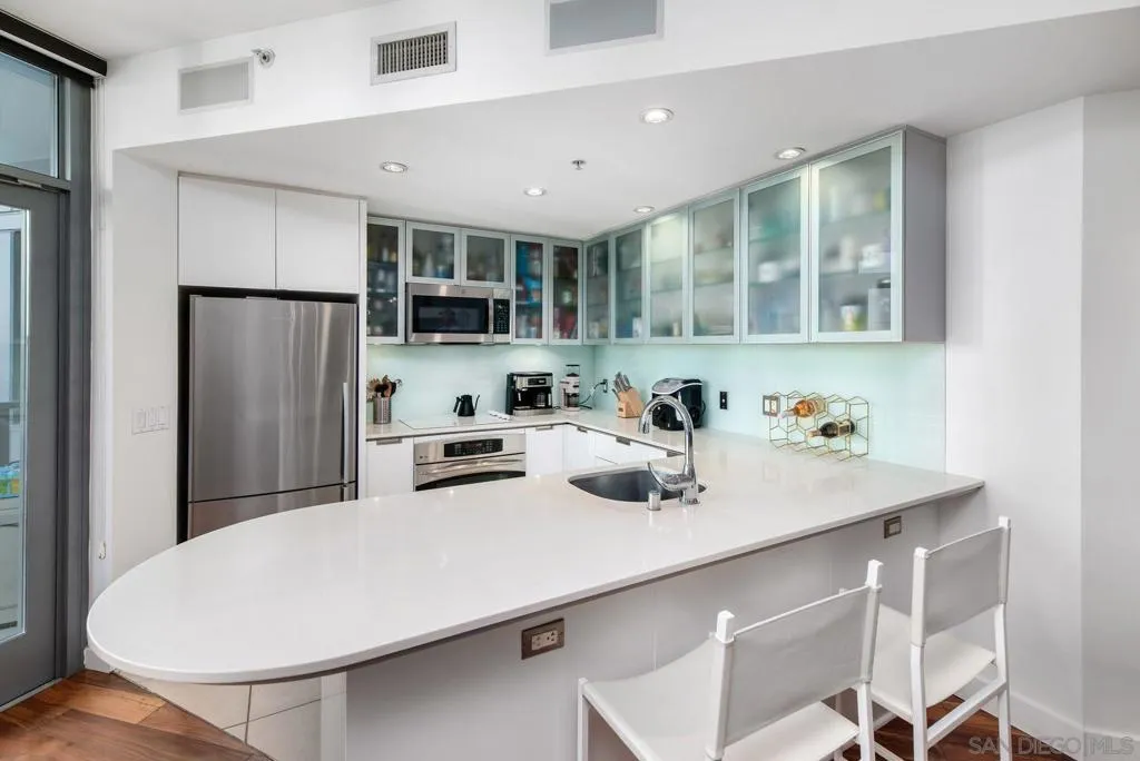 Live in the coveted Aria building perched on Cortez Hill. This contemporary turn key condo has an open floor plan with high ceilings, ample natural light, outfitted for surround sound throughout with Acacia wood flooring. Enjoy your morning coffee or an evening glass of wine on your spacious balcony. Kitchen is complete with quartz island/countertops, glass back splash, newly re-finished cabinets with a 10 year warranty and stainless steel energy efficient appliances. Full size stacked washer/dryer convey. 2 car (tandem) underground secure parking spaces #56. This modern complex features, a gym, rec room/club house, heated pool and spa. Excellent walk score, steps to Balboa Park, Tweat Street Park, Little Italy, Gaslamp District, Hillcrest and short drive to the airport.