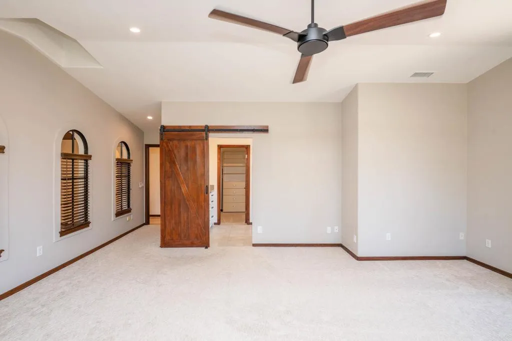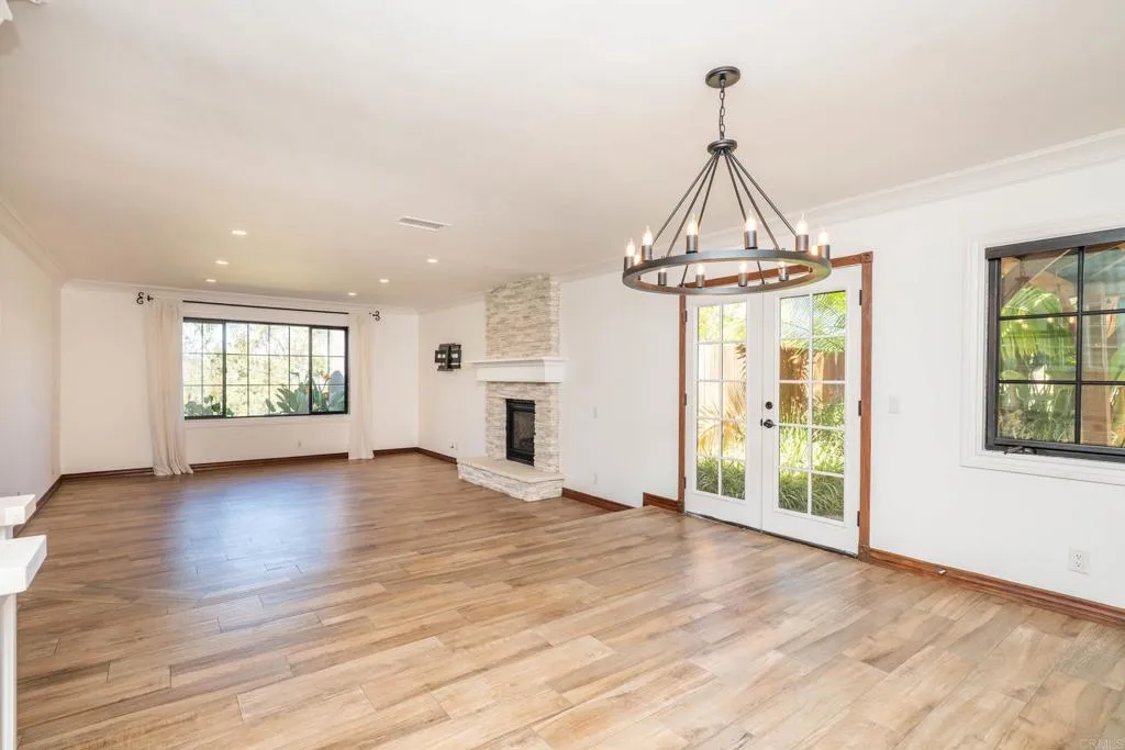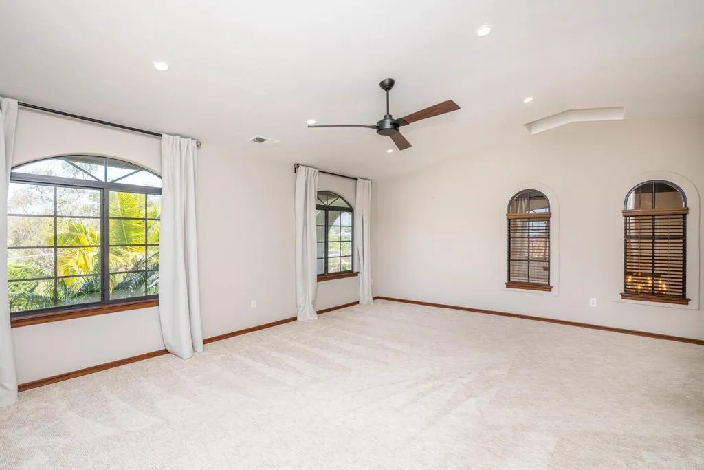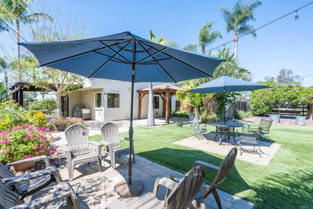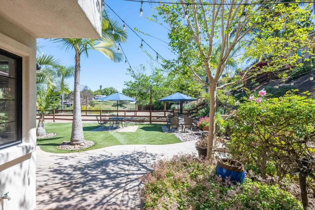 Stunning Mediterranean-inspired 3,500 sq. ft. two-story home situated on a private ½-acre lot with beautiful sunset and rolling hill views in Vista. This fully remodeled 5-bedroom, 4-bathroom custom home offers both elegance and comfort. The gourmet kitchen features quartzite countertops, a large center island, and stainless steel appliances, perfect for everyday living and entertaining. A dramatic two-story foyer with double-door entry and a curved staircase leads into the spacious living and family room areas. Upstairs, the primary suite showcases vaulted ceilings and a spa-inspired bathroom with dual vanities, mirrored storage, a custom marble shower, and a freestanding soaking tub. A second primary suite includes its own bathroom, walk-in closet, and private deck access. Three additional bedrooms share a beautifully remodeled guest bathroom. Features a second-floor laundry room with an LG washer and dryer, storage and desk, plus a 2-car garage with epoxy flooring and driveway parking for three additional vehicles (no RV/boat). Step through French doors to enjoy multiple outdoor entertaining areas and a lush tropical yard featuring two covered patios, a natural gas barbecue, and a pergola seating area. Gardener and pest control services are included. This beautifully renovated home offers space and luxury upgrades in a desirable Vista location. The entire property is smoke-free. Does not include detached garage or vacant land.