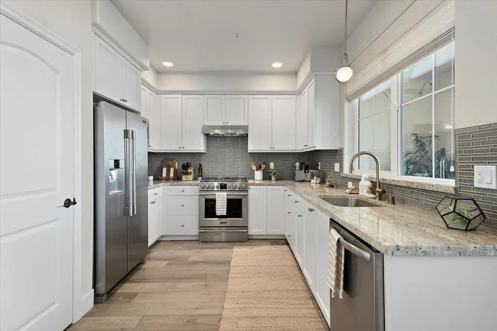 Outstanding 2 bedroom 1 1/2 bathroom fully remodeled unit only 10 years old! Great location! This unit includes custom kitchen with white shaker cabinets, full slab granite counters, all stainless steel appliances including microwave, refrigerator, dishwasher, 5 burner gas stove/oven. Wide plank Laminate flooring throughout! Wide baseboards! Plantation Shutters throughout. Dining Room/Family Room/Kitchen combo. Recessed lighting in the kitchen! Outdoor patio/balcony! Custom half bath on main level with tile floors, custom vanity! Upstairs has 2 bedrooms and 1 full bath! Walk in closet, Master bath has custom full slab stall shower, Custom Vanity and double sink with tile floors. Central Forced Air! Underground parking! Electrical chargers and bike storage on site. Tankless water heaters HOA covers water, garbage. Elevator on site. Townhouse style with noone above or below!