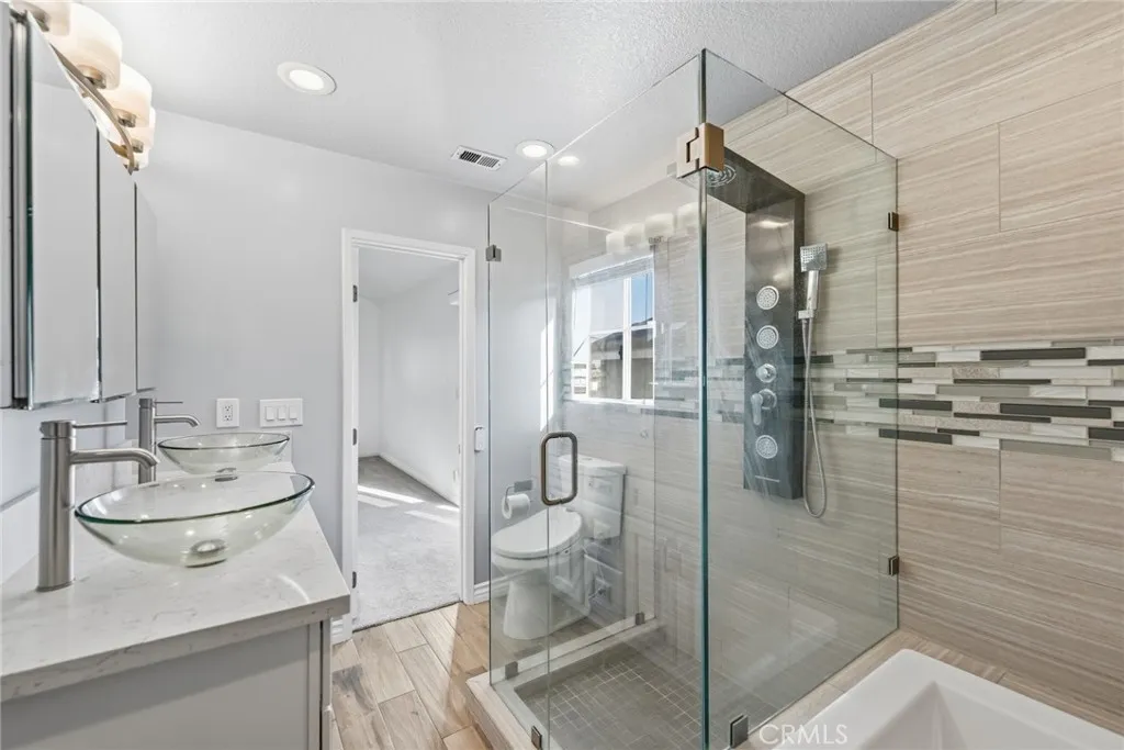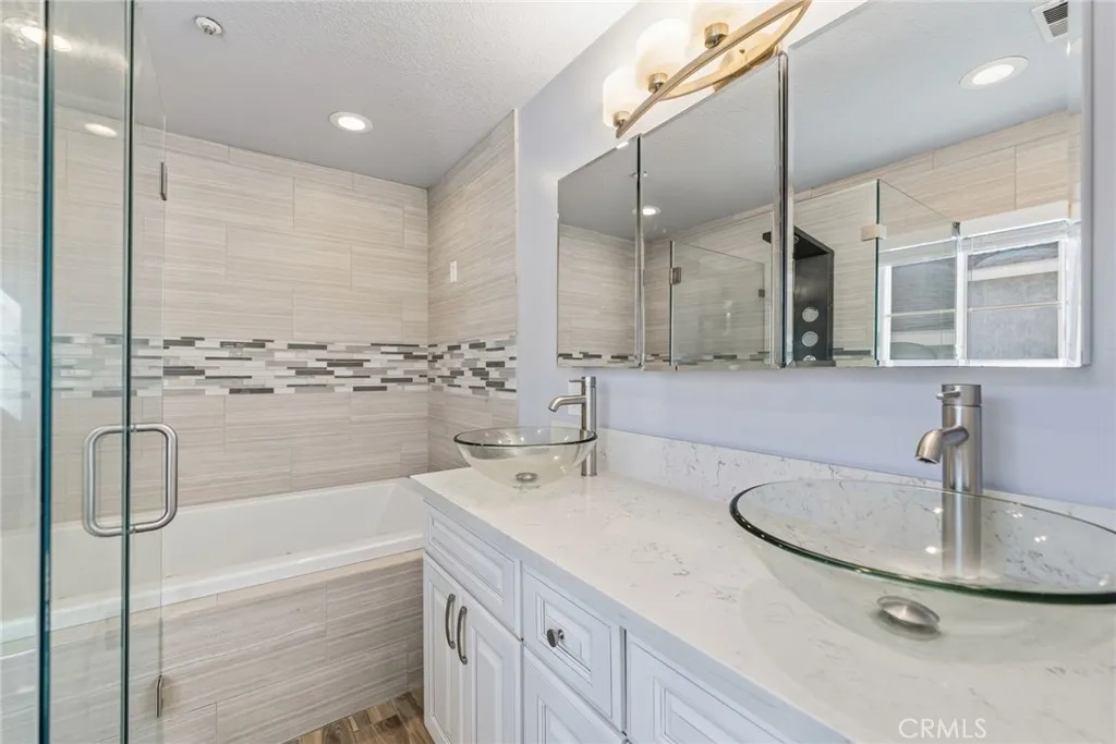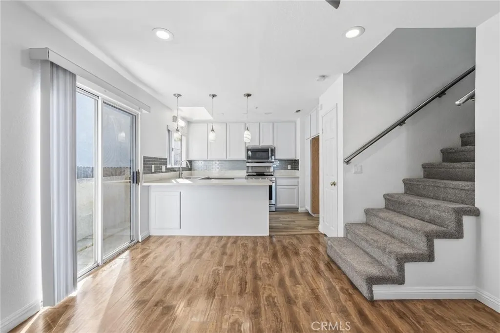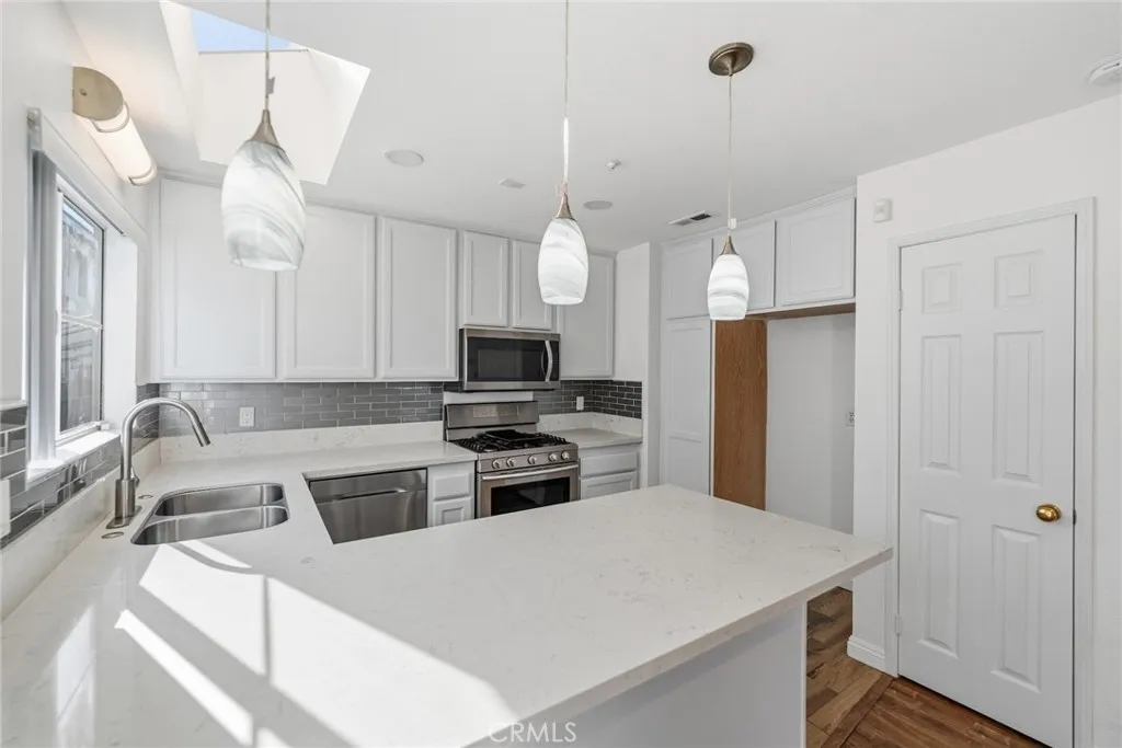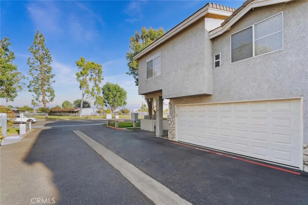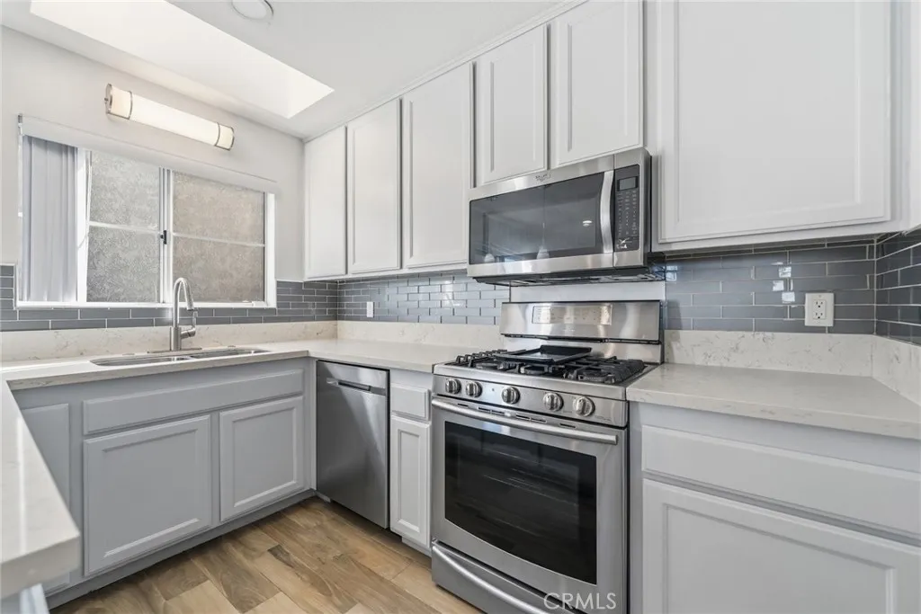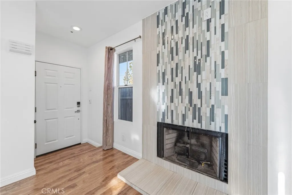 Welcome to this beautifully upgraded end-unit condo featuring 3 spacious bedrooms, 2 full bathrooms, and a 2-car attached garage. This cozy home is move-in ready and thoughtfully enhanced with modern conveniences. Enjoy cooking in the remodeled kitchen with white shaker cabinets, quartz countertops, reverse osmosis water filtration, and Samsung stainless-steel appliances. The open layout flows into a warm living room with a fireplace and sliding glass doors that lead to a wrap-around patio—perfect for morning coffee or outdoor dining. Upstairs, you’ll find all three bedrooms and two remodeled bathrooms, including a primary suite with a glass-enclosed shower, large jacuzzi tub, and private balcony. A stackable washer and dryer are conveniently located in the upstairs laundry closet. Recent upgrades include a new HVAC system, new water heater, EV charger, smart Wi-Fi door lock, Ring doorbell, outdoor floodlight camera, security system, and Wi-Fi garage door opener with battery backup. Guest parking is located directly across from the unit. Located in the heart of Cypress, this home offers access to top-rated schools including Oxford Academy, nearby parks, shopping, and dining. A perfect blend of comfort, convenience, and value.