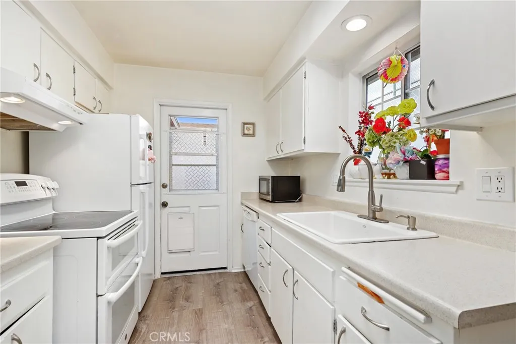 Welcome to this beautifully maintained single story townhouse located in the desirable Harbor Valley community of Fountain Valley. This rare end unit offers privacy, natural light, and a peaceful setting with views of the community's open green space, pool area, and sport courts. The home features a comfortable and efficient floorplan with one bedroom and one bathroom, designed with an open layout that connects the kitchen and living area for an inviting living space. The galley style kitchen includes laminate countertops and ample cabinet storage while remaining open to the main living area, making it ideal for everyday living and entertaining. Recent improvements include new hard surface flooring throughout the interior, creating a clean and modern feel from the moment you enter. The bathroom has been thoughtfully updated and features a stunning walk in shower with stylish finishes. The home is also equipped with a newer split system HVAC providing both heating and cooling for year round comfort, along with a newer upgraded electrical panel. The private patio offers a versatile outdoor space and includes a large storage shed that can serve as additional storage, a hobby room, craft space, or small workshop. From the patio you have direct access to the two-car garage, which includes laundry hookups and plenty of room for parking and storage. This desirable end unit location provides beautiful views of the expansive community open space and recreation areas. Harbor Valley is a well established and well maintained community with mature landscaping, plenty of guest parking, and low HOA dues. Conveniently located near shopping, restaurants, and everyday amenities, this home is also just a short drive to Mile Square Park and approximately 20 minutes from the beach. With central Orange County access and close proximity to major freeways, this location offers both comfort and convenience. A wonderful opportunity to own a thoughtfully updated home in one of Fountain Valley's most established communities.