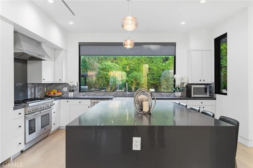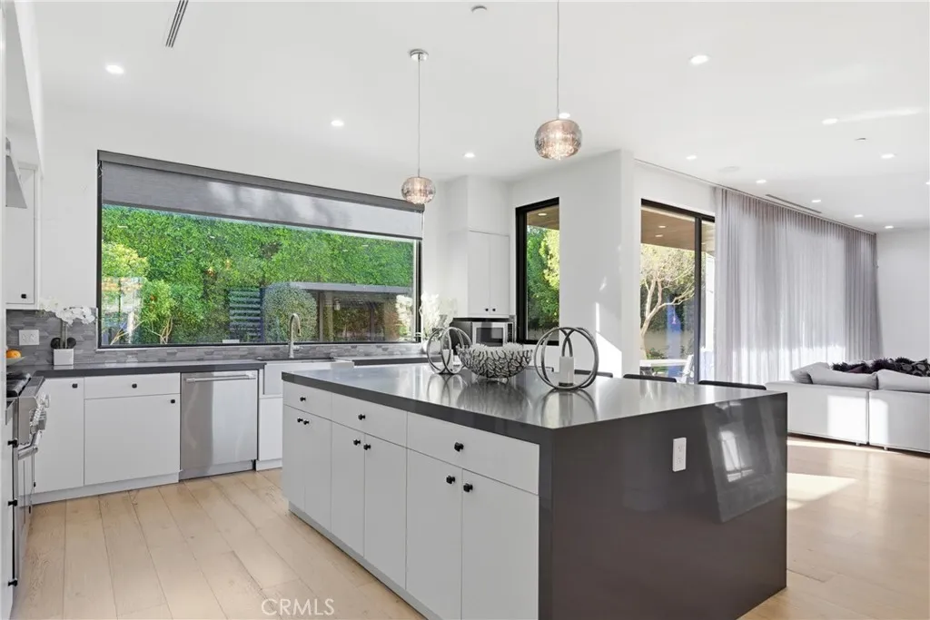 Welcome to a One-of-a-Kind Masterpiece in the Heart of Sherman Oaks. Situated on an impressive 10,580 sq.ft. lot, this exceptional residence offers 4,860 sq.ft. of beautifully designed living space with 6 bedrooms and 5.5 bathrooms. Built in 2019 with outstanding craftsmanship and meticulous attention to detail, the home features a seamless open-concept floor plan ideal for both everyday living and elegant entertaining. As you step inside, you are welcomed by soaring ceilings, a grand designer chandelier, and wide-plank oak flooring that flows throughout the home. Expansive windows fill the space with natural light and offer beautiful views of the resort-style backyard. The formal living room flows effortlessly into the dining area, creating a sophisticated space for hosting and gatherings. At the heart of the home is the chef’s gourmet kitchen, featuring top-of-the-line appliances, sleek quartz countertops, and a massive center island perfect for cooking and entertaining. Custom cabinetry provides ample storage, while a cleverly designed hidden walk-in pantry maintains the kitchen’s clean and elegant design. Adjacent to the kitchen is the spacious family room with a fireplace, creating a warm and inviting atmosphere. Beneath the staircase, a custom-designed wine cellar serves as a striking architectural feature, making a bold statement of luxury and lifestyle. The main level includes an en-suite bedroom ideal for guests or extended family, along with an additional flexible bedroom perfect for an office, media room, or gym, and a stylish hotel-inspired powder room. Upstairs, a spacious loft offers a versatile lounge and opens to a covered balcony. Each secondary bedroom features its own en-suite bathroom. The primary suite is a luxurious retreat with a fireplace, two walk-in closets, a makeup station, and a private balcony overlooking the backyard. The spa-inspired bathroom features dual vanities, a soaking tub, and a rain shower. The resort-style backyard is designed for entertaining and relaxation, featuring a sparkling pool & spa, covered patio for outdoor dining, cabana, outdoor kitchen with built-in BBQ,and surrounded by lush landscaping for privacy. Additional amenities: a solar system, indoor & outdoor speakers and security alarm. Located minutes from Ventura Blvd, Westfield Fashion mall, top-rated schools, upscale dining, and major freeways, this exceptional home offers the perfect blend of luxury living and prime Sherman Oaks location.