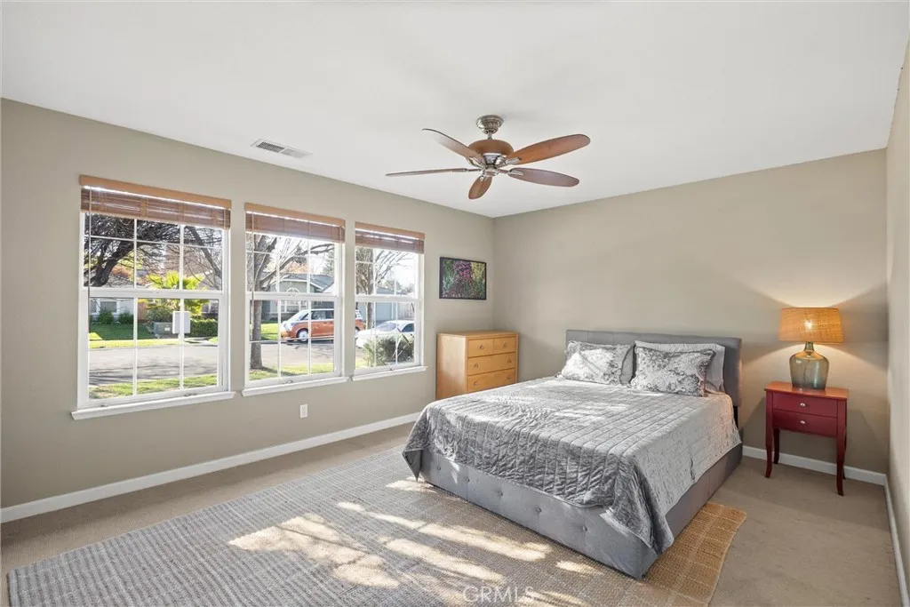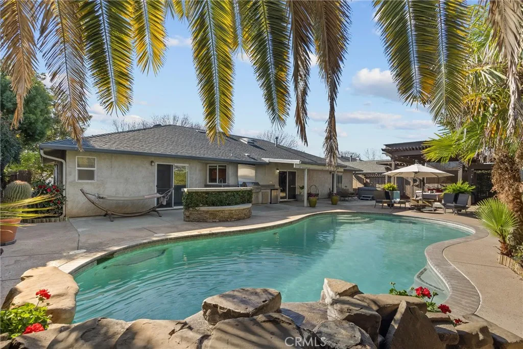 If you’ve been waiting for an Amber Grove home that truly captures the lifestyle people love about this neighborhood, this may be the one. Tucked on a quiet cul-de-sac, this beautifully maintained home was designed for both everyday comfort and unforgettable gatherings, with spaces that invite you to slow down, connect, and enjoy the best of Chico living. A welcoming front porch sets the tone, offering a place to sit back and enjoy the neighborhood as neighbors stroll and bike through the community. Inside, thoughtful updates and flexible living spaces create a home that is both functional and comfortable. Tile flooring provides durability and easy maintenance, while the home is pre-wired for multiple audio options with a dedicated media closet and infrared transmitters that allow equipment to remain neatly hidden. The layout offers comfortable living throughout, including a spacious primary suite with its own en-suite bathroom, creating a private retreat at the end of the day. The fourth bedroom features a sliding door that opens directly to the backyard along with convenient access to a full bathroom with walk-in shower, offering flexibility for guests or additional privacy. Step outside and the backyard becomes your own private resort. The 16x36 kidney-shaped pool offers plenty of space for swimming laps or floating the afternoon away while enjoying the peaceful sound of the stone waterfall. Lush greenery including creeping fig, star jasmine, honeysuckle, banana plants, and a queen palm soften the space and create a tropical feel. The custom pergola creates an outdoor living room designed for year-round enjoyment, complete with an outdoor TV and space ready for movie nights under the stars. The outdoor kitchen features natural gas, an outdoor refrigerator, and sink for effortless entertaining. After a swim, rinse off in the outdoor shower or unwind in the hot tub with optional saltwater system, adding even more ways to relax and enjoy the space. The finished three-car garage features professional-grade epoxy floors and extensive attic storage above, with walkable space supported by reinforced rafters. Located in Chico’s beloved Amber Grove neighborhood and just moments from Petersen Park, residents enjoy open green space, playground, basketball court, and a community known for its holiday celebrations, neighborhood gatherings, and strong sense of connection.