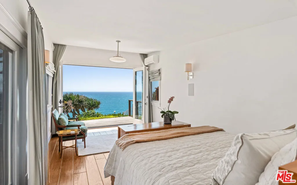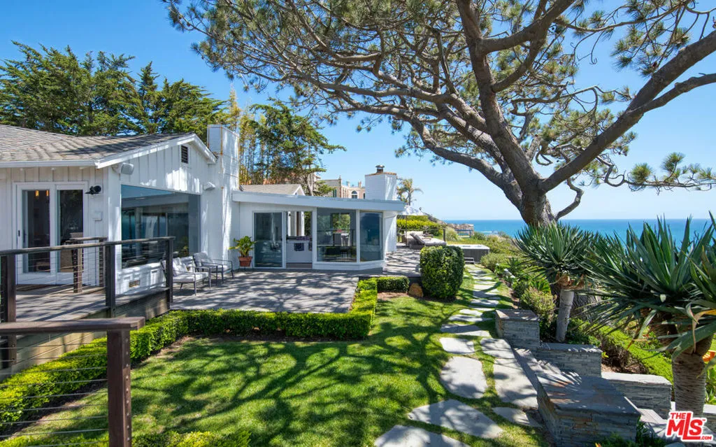 Perfectly situated on a bluff above Westward Beach, this resort-like, single-level residence is surrounded by gorgeous landscaping and sensational coastline and ocean views. Over an acre of manicured lawns and gardens offers an idyllic setting for sparkling daytime and starlight entertaining, while the spacious, open interior invites harmonious gatherings large and small. Wraparound decks, multiple patios, steps to the sand, and immaculate, comfortable decor make every part of the property a tempting spot to relax. Gated and very private, the residence is set well back from the road, with a long drive, huge front lawns, generous guest parking, and an enormous sunken firepit and patio surrounded by fruit trees. The double front doors open to display dramatic sight lines direct to the ocean. The interior is serene and bright, with wood plank ceilings and floors, wraparound windows, and congenial indoor-outdoor flow. A spacious foyer with a bar steps down to the living room, which has a lovely corner fireplace, floor-to-ceiling windows on three sides, and an ocean-view deck. A wide doorway leads to the dining area, which also has a corner fireplace, majestic ocean views, and a deck just outside. The large space is shared by the kitchen, complete with island, bar seating, top-quality appliances, pantry cabinets, and a reading nook. Adjacent to the kitchen/dining room is a family room, which opens to an office space with a powder room and a walk-in closet. There is also a media/recreation/family room with high truss ceilings, wet bar, storage cabinets, and another powder room. Off the foyer, a hallway leads to two bedrooms, while the primary suite is entirely detached from the main house. A private retreat with the feeling of a resort bungalow, one end of the suite has accordion glass doors that open fully to the view and a private deck, while a set of sliding glass doors open onto another deck. In addition to a walk-in closet, the suite has a spa-like bathroom with a small private patio. An ocean-view deck wraps around the back of the house, with areas lighted and furnished for al fresco dining, lounging, and entertaining. There is a Viking barbecue, a deck-front Jacuzzi, a large Buddha fountain, and steps to a lower terrace with a lawn and seating for dolphin-watching and star-gazing. A private stairway leads down to Westward Beach. The home is equipped with security and ample storage, including a one-car garage or golf cart space. With the atmosphere of an island resort and the conveniences of nearby Point Dume, this is a truly stunning refuge in a remarkable setting. Short term rate- $40,000 per month.