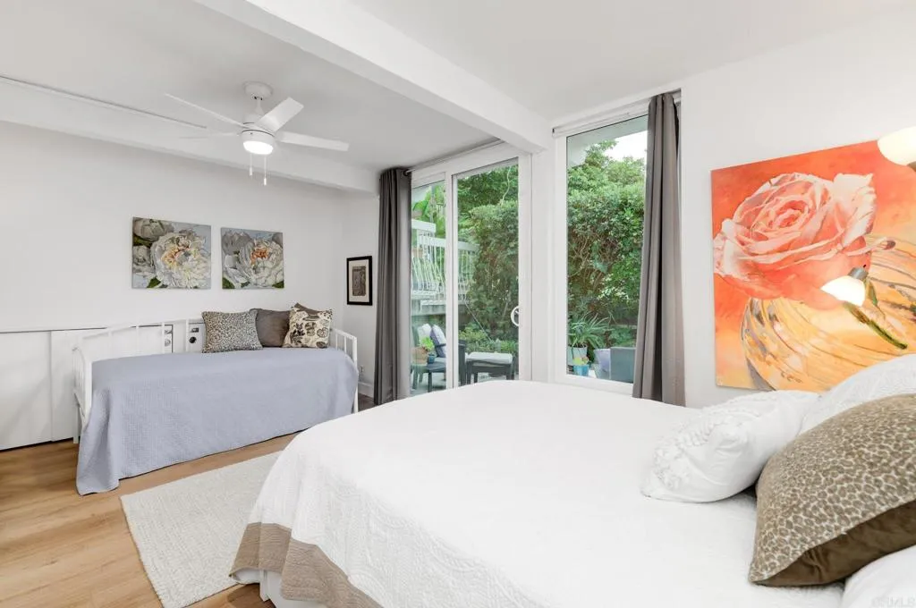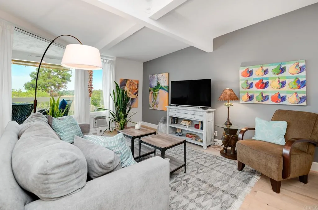 Don't miss out on this gorgeous tri-level end-unit townhome with rare dual views! Convenient location. Ocean sunsets from the upper-level balcony at the back and tranquil garden views from the front. This is the only condo in the development with both front and back views, and with only one shared wall it offers exceptional privacy. The home features two balconies, one off the primary bedroom and a spacious balcony on the top floor that extends the living area and is perfect for relaxing or entertaining. The upper living level showcases vaulted, beamed ceilings and over-sized picture windows facing east and west, filling the space with natural light and refreshing sea breezes, while the garden patio off the second bedroom provides a peaceful shaded retreat. The home has been extensively upgraded, including all new Anlin windows and sliding doors, covered by a double lifetime transferable warranty. The upper level has Bravada Contempo hardwood flooring and new baseboards, while the middle level features Oasis El Capitan water-resistant laminate flooring and new baseboards, and all stairs have been updated with Gulistan Hawthorne stain-resistant carpeting. The hall bathroom has been fully renovated with a custom tile and glass shower, new vanity, sink, mirror, and fixtures. Four new wall heating units service individual zones in the living room, dining area, and both bedrooms. Parking is convenient with a two-car garage plus additional space for two cars in the driveway. This home is superbly located, close to the ocean, great shopping and dining, and just minutes from the La Costa Golf & Spa Resort. This beautifully upgraded home with rare views and an unbeatable location will not last long on the market!