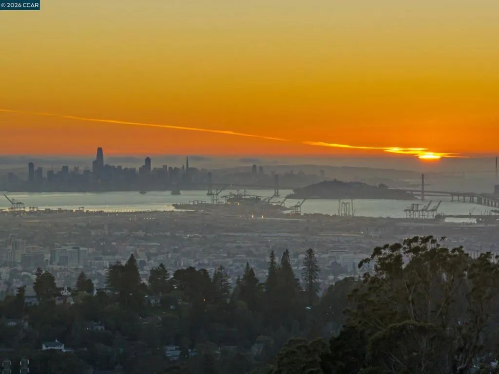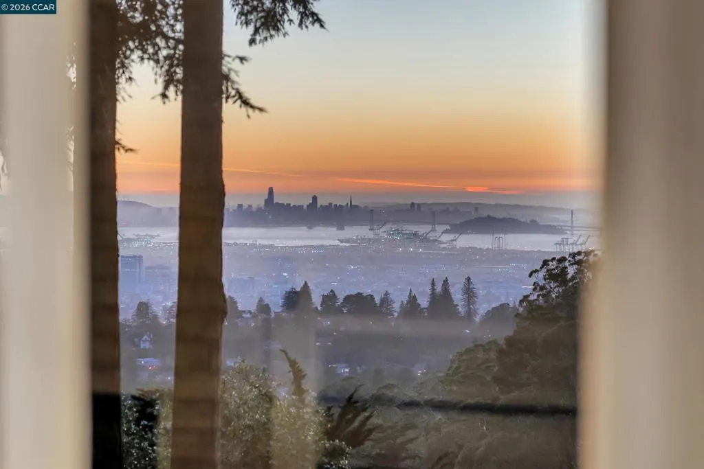 Perched in the Montclair hills, this updated 3-bedroom, 2.5-bath home with studio ADU offers approximately 1,780 sq ft and sweeping views across the Bay—from Lake Merritt and the Bay Bridge to the San Francisco skyline, Golden Gate Bridge, and Marin Headlands. Expansive picture windows and vaulted ceilings with exposed beams fill the home with natural light while framing the dramatic panorama.The main living area features a gas fireplace and view balcony positioned to capture sunsets and city lights. The remodeled kitchen includes quartz countertops, semi-custom cabinetry, and GE Café appliances, creating a bright and functional space for everyday living and entertaining. Multiple walkout outdoor living areas make the home especially unique, including a welcoming front courtyard, brick patio dining area off the kitchen, large fenced backyard, and the view balcony—offering spaces to enjoy morning coffee, host gatherings, or unwind while taking in the Bay views.The separate studio ADU provides flexible space complete with rooftop deck and views of the bay. Located minutes from Montclair Village, Joaquin Miller Park, Redwood Regional Park, and hiking trails, this property combines scenic hillside living with convenient access to shops, dining, and commute