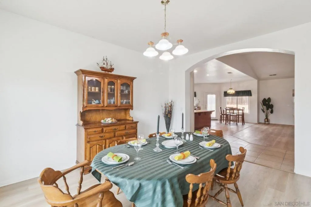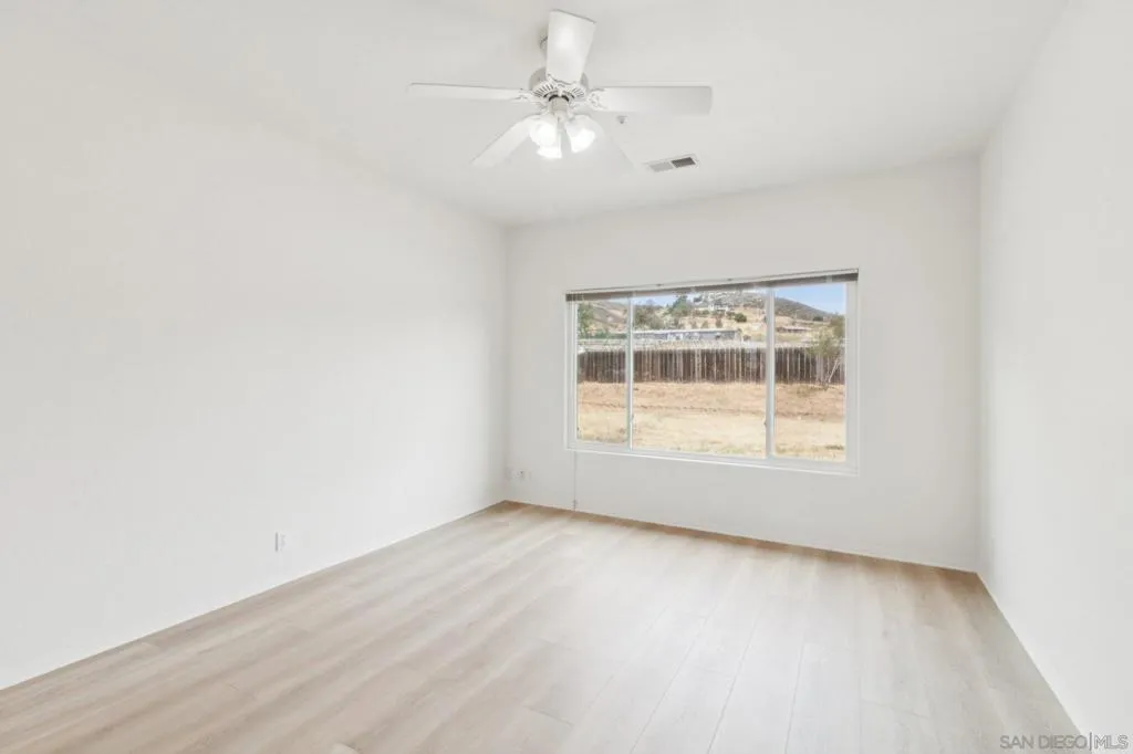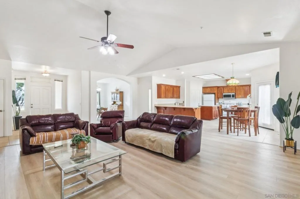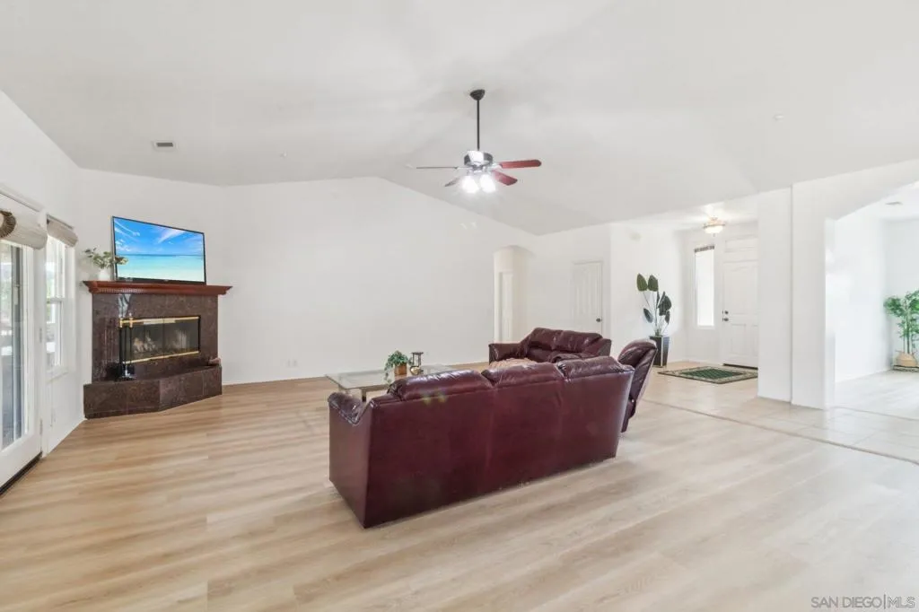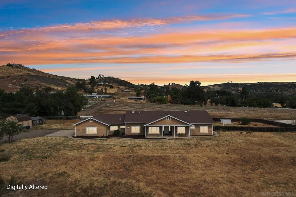 Single-level 4 spaceous bedrooms plus a large office/game toom 3 bath, 3,008 sq ft home on 2.25 acres of flat, usable land with peaceful mountain views. Quality construction throughout with wide doors, bullnose corners, curved archways, 9 ft ceilings, skylights, recessed lighting, and four ceiling fans. Spacious island kitchen with Corian counters top, walk-in pantry, and breakfast bar. Large great room with fireplace and French doors leading to the back patio. Primary suite includes French doors, walk-in closet, cultured marble tub and sinks, and a spacious bedroom layout. Additional bedrooms are generously sized. Wide 4-ft hallway with sconces, dedicated office, and full laundry room. Finished, insulated 3-car garage with storage shelves. Property offers room for horses, chickens, RV parking, and additional uses, subject to local guidelines. Quiet, serene setting with open, usable land. Enjoy your everyday beautiful setting inside, and out side mountain views. Single-level home with wide doors and spacious bedrooms on 2.25 acres of flat, usable land. Quality construction with 9 ft ceilings, skylights, curved archways, and a large island kitchen. Finished 3-car garage with storage and room for RV parking. Property offers open land suitable for horses, animals, gardens, or future improvements, buyer to verify all uses with County of San Diego. Septic, and all systems maintained by long-term owners. Quiet, private setting with mountain views and easy access to town. All information deemed reliable but not guaranteed; buyer and buyer’s agent to verify all before COE.