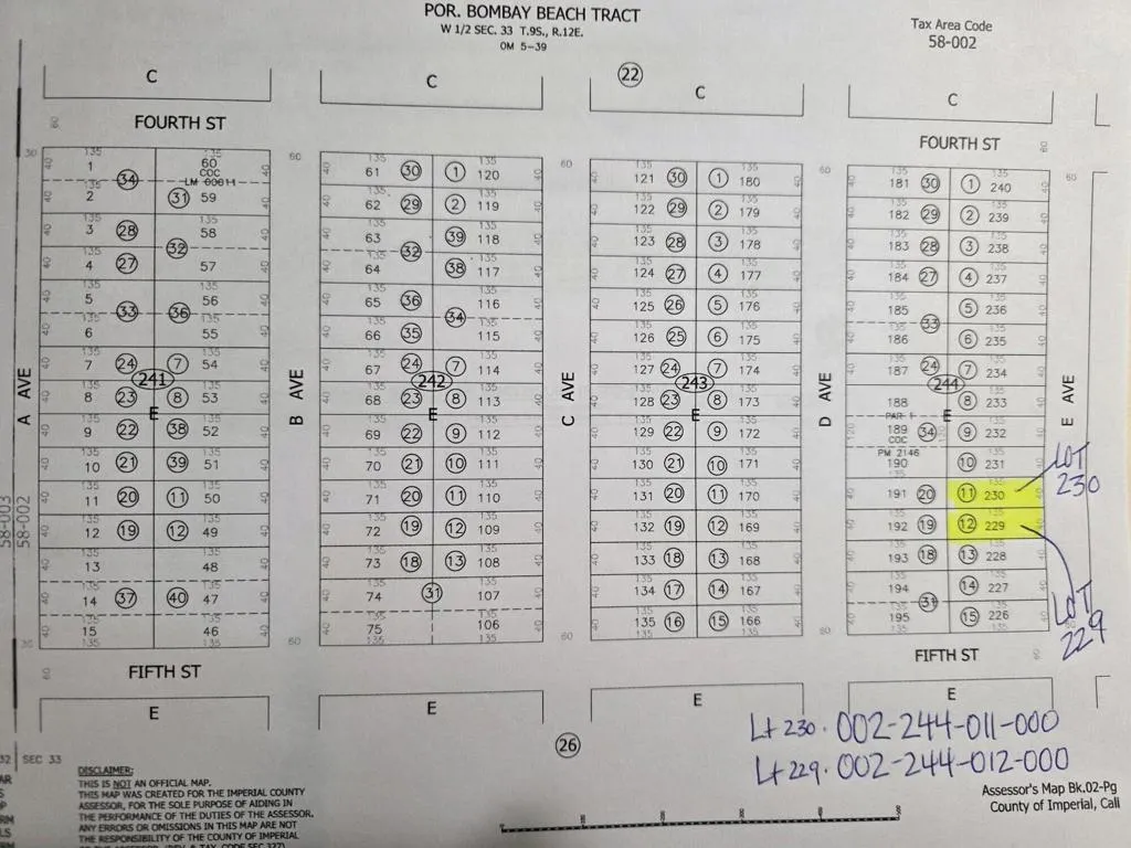 Bombay Beach, Ca. Unimproved Residential Lot 229 on Avenue E. Located Between 4th and 5th Streets. (From 5th Street going North, go approx 140 feet to the North and on the West side you should be at approx middle of Lot 229), You own the land. Utilities are along property lines. Bombay Beach is a popular destination to people from all over the world. Its has Eclectic apocalyptical charm, Artists attractions and Ruins from days gone by. Town often has weekly events in the gorgeous winter months. The popular SKI Inn Bar & Restaurant in town often hosts live music. Events on the beach. Bombay Beach attracts permanent and winter residents, artists, musicians, writers, etc. Here is your chance to get your own spot in this increasingly popular town. Property sold ''AS-IS'' . Seller and/or agent make no warranties. All information deemed reliable however buyer to do their own due diligence / investigations to satisfy themselves. APN: 002-244-012-000. Note: Seller is also selling adjacent lot to North APN 002-244-011-000 Lot 230 for$24,900 as well.