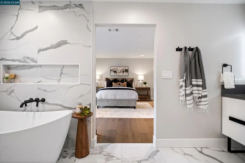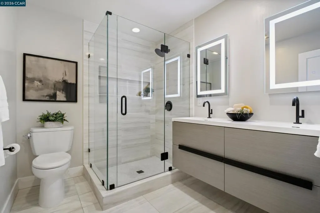 Located in one of Danville’s most desirable neighborhoods, this beautifully renovated East-facing single-story home blends modern design, comfort, and effortless California living. With 4 bedrooms and 2 updated bathrooms, the home features bright, airy interiors, vaulted ceilings, and engineered hardwood flooring throughout. The open layout creates a seamless flow between living spaces, ideal for both everyday living and entertaining. At the heart of the home, the renovated kitchen showcases a large center island with seating, custom cabinetry, a walk-in pantry, and upgraded finishes that combine style with functionality. Both bathrooms have been refreshed with clean, modern design, including sleek smart mirrors. Owned solar and a Tesla charging station add energy efficiency and convenience. The private backyard is designed for relaxation and entertaining, featuring a built-in gas fire pit patio and an outdoor movie screen for evenings under the stars. A detached studio offers flexible space for a home office, gym, creative studio, or storage. Residents enjoy community amenities including a pool, tennis courts, greenspace, and play structures. Located near top-rated schools, parks, scenic trails, and downtown Danville’s shops, restaurants, and events, this home has it all.