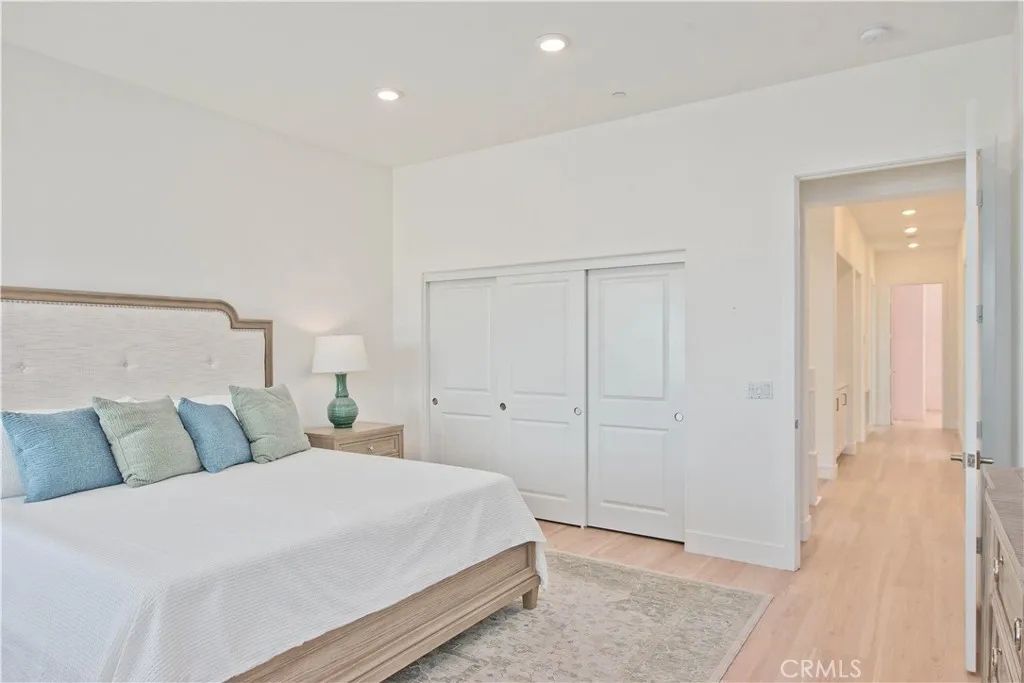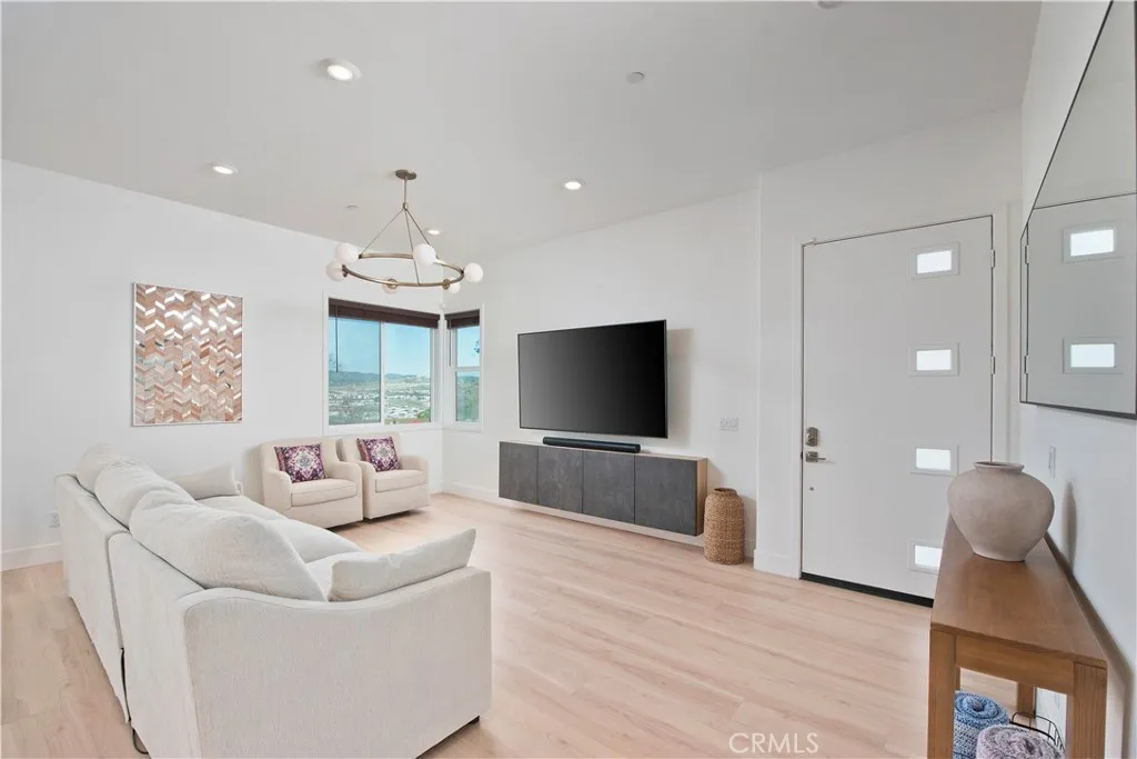 Welcome to this stunning modern detached home in the Rosemist community of FivePoint Valencia. Situated on a prime corner lot, this expansive 5-bedroom, 4.5-bathroom, three-story residence offers over 3,300 square feet of thoughtfully designed living space with scenic mountain views. Upon entry, you’re greeted by a bright open-concept floor plan featuring sleek laminate flooring throughout and stylish designer light fixtures that create a clean, contemporary feel. The gourmet kitchen features a large center island with bar seating, sleek upgraded countertops with a herringbone backsplash, abundant storage, and stainless steel appliances including a professional-grade 6-burner cooktop with griddle, range hood, and built-in refrigerator. The kitchen opens to the living and dining areas, perfect for both everyday living and entertaining. The first level includes a convenient bedroom and full bathroom with updated fixtures and a Mid-Century modern vanity, ideal for guests or multi-generational living. On the second level, the spacious primary suite offers two closets including a walk-in closet, and an en-suite bathroom with dual vanities and a separate shower and bathtub. The second floor also features three additional bedrooms, including one with its own en-suite bathroom, another full bath, and a laundry room with plenty of storage. The third floor features an expansive bonus room complete with a connecting dry bar and powder room, offering a versatile space ideal for a home office, gym, or media room. Sliding doors open to a covered deck with sweeping mountain views. Designed for indoor-outdoor living, expansive corner sliding doors open to the California Room, seamlessly connecting to the backyard with low-maintenance artificial turf. Additional highlights include an attached 2-car garage with extra storage, direct home access, and two EV chargers, plus solar panels and a backup battery system. Enjoy the community’s impressive recreation areas. Just across the way is Confluence Park, an HOA recreational area featuring swimming pools, a spa and splash zone, lounge areas, a clubhouse, a park, and more. In addition, the community offers a community garden, pump track, and miles of scenic trails for residents to enjoy. Conveniently located minutes from Valencia Town Center, Six Flags Magic Mountain, shopping, dining, parks, and hiking and biking trails, with easy freeway access.