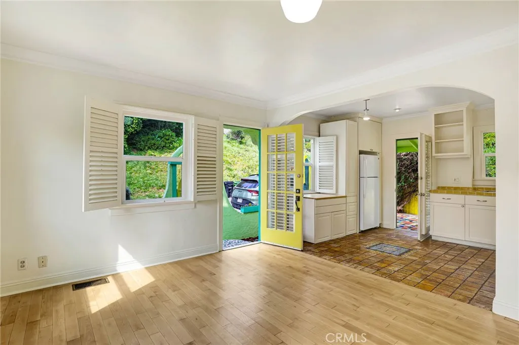 Perched above the treetops of Elysian Heights, this enchanting two-story Spanish-style casita offers a rare blend of privacy, character, and breathtaking hillside tranquility in the heart of Echo Park. Tucked away on a peaceful cul-de-sac, the home feels like a secluded artistic retreat while remaining moments away from the neighborhood’s beloved cafés, markets, and scenic trails. Inside, sunlight fills inviting living spaces, highlighting rich wood floors, custom built-ins, and vibrant details that celebrate the home’s vintage charm. The kitchen features striking custom tile work and a Viking range, blending timeless style with modern functionality while flowing seamlessly into the dining and living areas. French doors open to a serene outdoor setting where sweeping treetop vistas stretch toward the Downtown Los Angeles skyline. Enjoy quiet mornings on the patio or unwind on the covered rear deck as the peaceful hillside surroundings create a sense of calm rarely found so close to the city. The flexible layout includes two bedrooms upstairs and a downstairs primary suite with a fireplace, walk-in closet, and beautifully tiled bath with a clawfoot tub. French doors open directly to a private garden patio, creating a tranquil sanctuary. An air-conditioned detached studio offers a creative’s dream space—perfect for a recording, art, or photography studio, private gym, yoga retreat, or inspiring work-from-home environment. Surrounded by lush greenery yet minutes from Echo Park favorites including Canyon Coffee, Cookbook Market, Bacetti Trattoria, and the trails of Elysian Park, this distinctive hillside bungalow offers a rare opportunity to own a peaceful, design-forward retreat in one of Los Angeles’ most coveted neighborhoods.