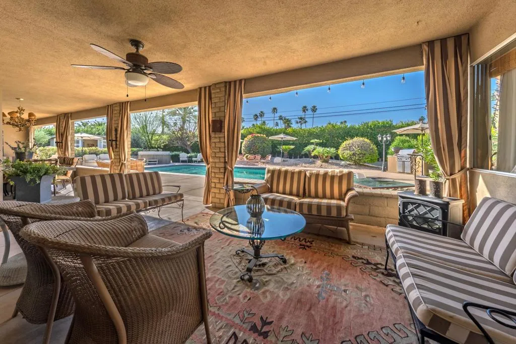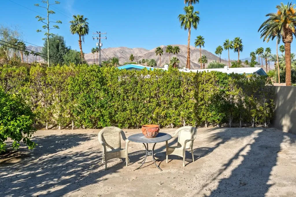 Stunning mountain and pool views abound from this charming mid century home in highly desirable South Palm Desert. Located on a nearly half acre lot, it features a large swimming pool, separate spa, small grove area with citrus trees and a quaint structure currently used as an art studio. The spacious covered patio allows for al fresco dining and lounging out of the hot desert sun. The interior is tastefully updated in a warm rustic style with a beautiful rock gas fireplace, tongue and groove ceilings, custom wood counters and updated appliances. The flow from interior spaces to patio and pool is perfect for our casual indoor/outdoor desert lifestyle. The large primary suite features a roomy walk-in closet, sliding doors to the patio and a full bath with sunken tub and shower as well as double vanities. There are also two generously sized guest rooms and a guest bath with access to the patio and pool areas. An attached two car garage, with ample storage and circular driveway provide plenty of guest parking for family and friends.. This home is located approximately three blocks South from the fabulous shopping and dining on El Paseo, one block from Shadow Mountain golf and tennis resort and a short drive to The Living Desert and multiple hiking trails. Call today for a personal tour of this unique property!