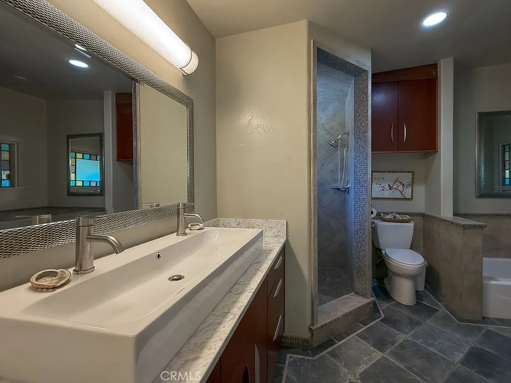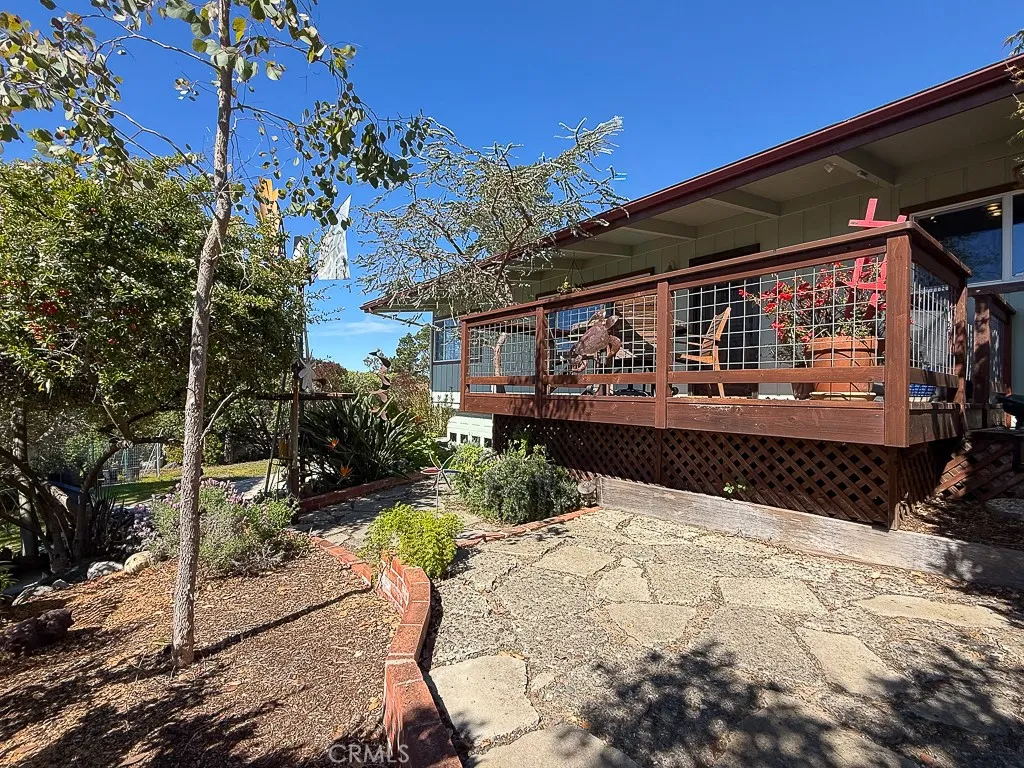 Artistic and full of character, this Pine Knolls home offers Moonstone Beach views and a uniquely creative living experience above Cambria’s West Village. Perched on a generous 13,450 sq ft lot, this 2-bedroom, 2-bath home offers 1,800 sq ft of inspired coastal living, along with a rare 1,300 sq ft three-car garage—an exceptional find in Cambria. Single-level living unfolds at the top of the stairs, where wood-beamed ceilings, bamboo and tile flooring, and an open-concept layout create warmth and character. The living area showcases a gas free-standing fireplace and flows into the dining space, where dramatic antique-style double doors open to a spacious bonus family room—ideal for a studio, media room, or creative retreat. The kitchen includes a Viking gas range and granite breakfast bar. The primary suite is located just a few steps up from the family room and features framed Moonstone Beach views, a dedicated office area, walk-in closet, and private access to a white-water view deck with a working hot tub. A guest bedroom and full bath complete the interior living space. The oversized 1,300 sq ft three-car garage includes built-in rolling cabinetry, a single front door and a two-car rear door—ideal for car enthusiasts, artists, or hobbyists. Additional features include ample off-street parking, fenced dog run, chair lift from the garage to the living level, low-maintenance landscaping and a new roof installed in 2022. Enjoy coastal wildlife and close proximity to shopping, dining, and wine tasting in Cambria’s West Village.
