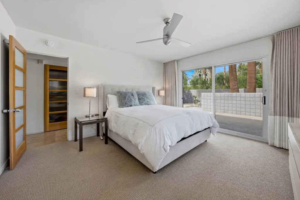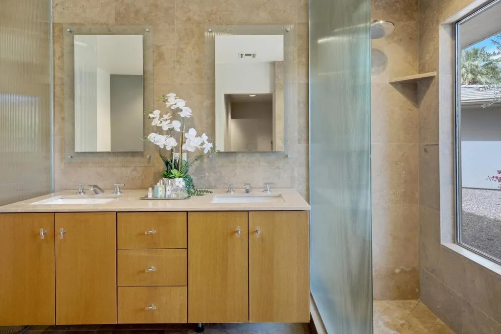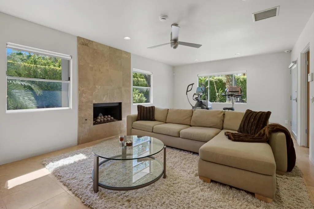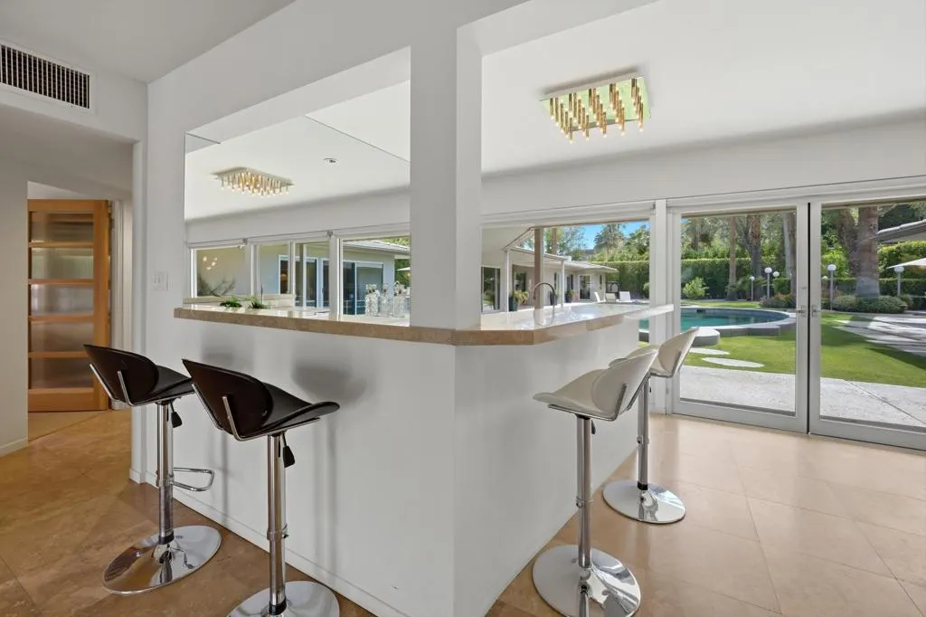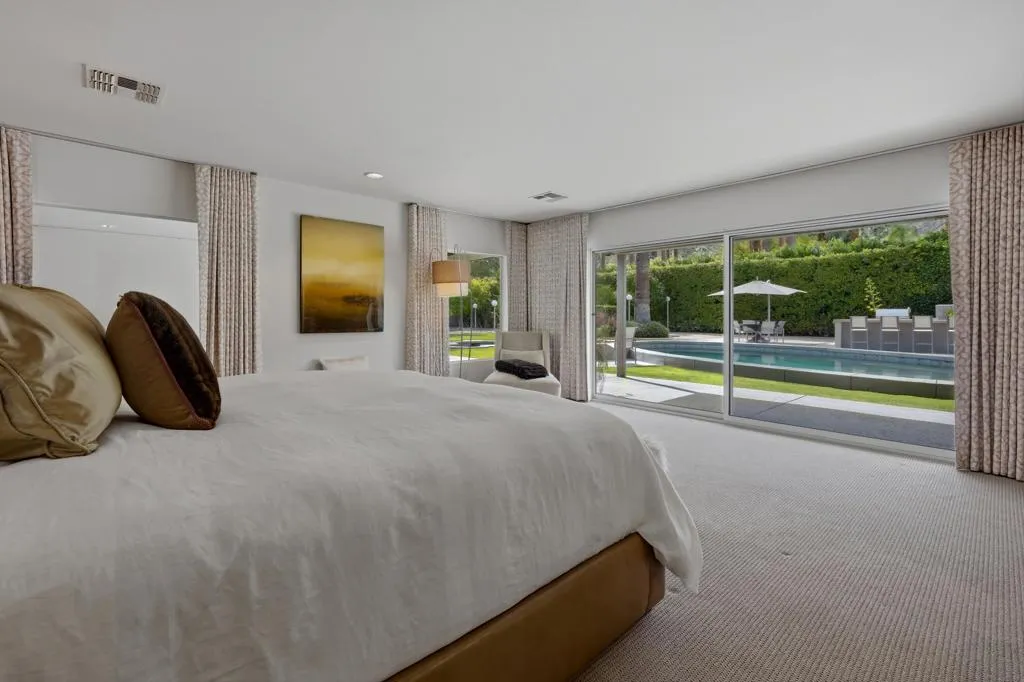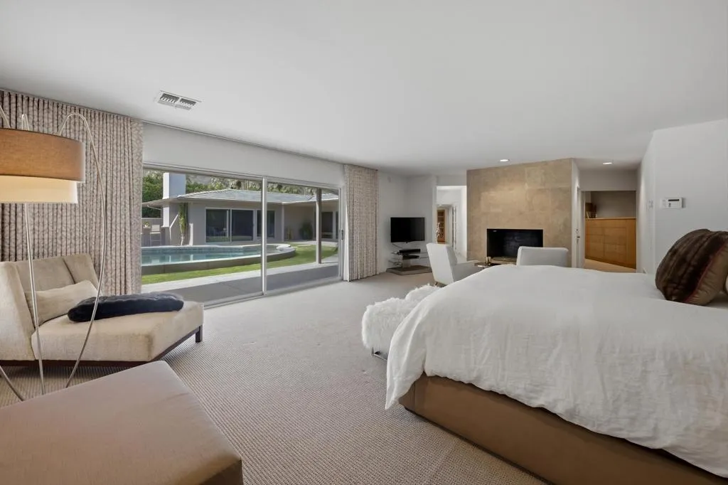 Located in the prestigious Old Las Palmas neighborhood in the heart of Palm Springs, this remarkable desert estate blends classic Palm Springs glamour with modern luxury. Once owned by legendary actress and comedian Lily Tomlin, the ''Lily Pad'' carries a touch of Hollywood history within one of the city's most iconic celebrity enclaves. Originally built in 1952 and thoughtfully reimagined for modern living, the estate spans approximately 4,671 square feet on more than half an acre of lush, gated grounds. Inside, sunlit interiors unfold through expansive living and entertaining spaces offering an atmosphere that is both sophisticated and relaxed - quintessential Palm Springs glamour with a contemporary edge. This home features 4 bedrooms, 7 bathrooms and thoughtfully designed living spaces with rich travertine tile flooring that create an inviting yet sophisticated atmosphere throughout. The heart of the home has a beautifully appointed chef's kitchen with custom cabinetry and stainless-steel features that include countertops, backsplash and huge refrigerator/freezer. High-end appliances include 2 Meile dishwashers and Viking double oven & gas cooktop. There is a seamless flow between the great room & family room, both designed for effortless entertaining, showcasing two of the home's five fireplaces, a stylish wet bar, and Fleetwood sliding doors opening to the spectacular resort-style backyard. The home's four bedrooms include a luxurious ensuite primary offering a serene private escape, complete with a cozy fireplace, elegant custom drapery, and direct access to the backyard. Two other ensuite guest bedrooms, thoughtfully separated from the primary bedroom, offer guests their own private living space. Adding to the compound's appeal, the estate was expanded with the construction of a nearly 1,000-square-foot guest house, complete with its own living area with fireplace, spacious bedroom suite and dramatic views of the surrounding desert mountains. Lily Pad's outdoor space reveals the estate's true magic. The resort-style grounds are centered around a custom pool and spa, with shaded lounge areas, a beautiful natural stone fireplace, outdoor kitchen, pool bathroom, and iconic desert mountain views. Towering palms and manicured landscaping evoke the golden age of Hollywood retreats. This exceptional property offers a rare opportunity to own a piece of Palm Springs' storied past while enjoying the comfort and elegance of a fully reimagined desert estate.