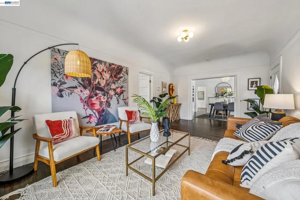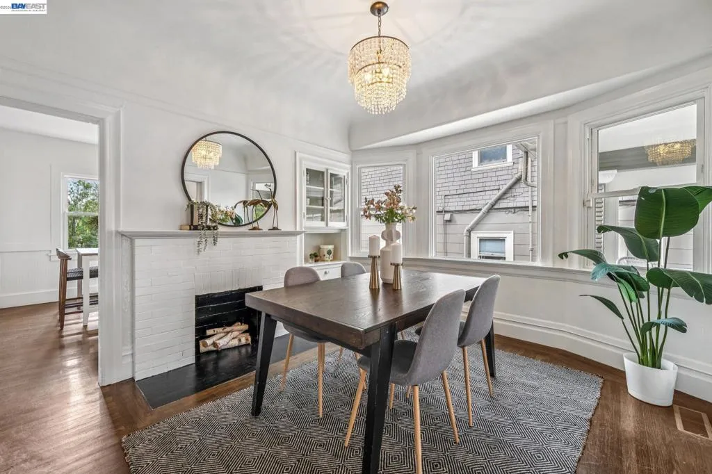 Timeless architecture and easy urban living await in this upgraded 2+BD/2.5BA Craftsman complete with a basement studio (with full bath and kitchenette). A bountiful blooming trellis and private gate welcome you to the 1182 SQFT main home that lives large. Sunlight streams into the living room with a coved ceiling, picture railing, and newer mullioned windows with a garden view. Beautiful hardwood floors span into the dining room where you can dine with family and friends in style with its fireplace, built-in cabinets, and bay window. The adjoining modern kitchen features a nearby powder room and an adjacent flexible space ready as a den or large breakfast nook. Two bright bedrooms with roomy closets share an upgraded jack-and-jill bathroom. From the backdoor, enjoy indoor/outdoor living in the spacious backyard with a big patio, fun play structure and mature landscaping. There’s plenty of space to entertain, relax, and garden. A separate exterior door leads to over 1000 sqft of bonus space, offering a kitchenette, stylish full bath and recessed lighting, perfect as an office, guest room, studio, or den. In the large basement, find the laundry room, garage access, and more flex space. Ideally located near the Emeryville Greenway path, Berkeley Bowl, & Bay Street.