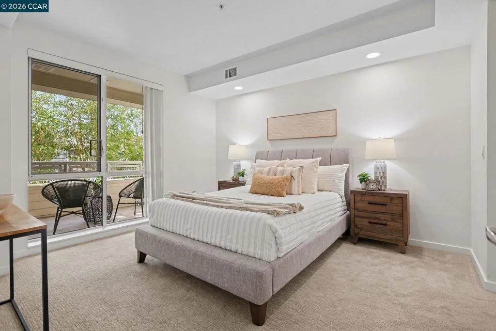 A sought-after floor plan at The Mercer featuring a spacious living room with a cozy gas fireplace, a separate dining area large enough for a round table, and a versatile den. Facing west, the home enjoys filtered afternoon light throughout. Extensive February 2026 upgrades make this residence feel truly move-in ready: new luxury vinyl plank flooring in the entry, den, dining, and living areas; new textured bedroom carpeting; fresh designer white paint; refurbished kitchen and bath grout; a new dining light fixture; and newly permitted recessed lighting in the living room and primary bedroom. The open kitchen includes a Sub-Zero refrigerator, Bosch dishwasher, microwave, gas range and oven, and stone countertops—ideal for everyday cooking or entertaining. The primary suite offers large windows overlooking bamboo and a spa-like bath. Residents enjoy outstanding amenities including a lap pool, spa, fitness center, BBQ area, and lounge. Located in the heart of Walnut Creek, you’re just steps from dining, shopping, transit, and the renowned Lesher Center for the Arts. Not to be missed!
