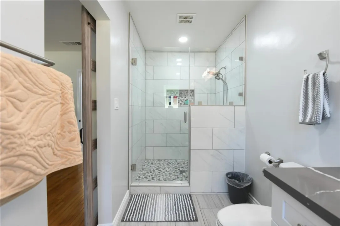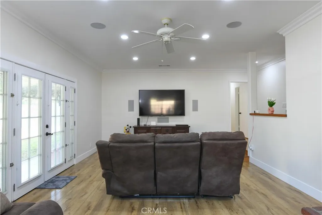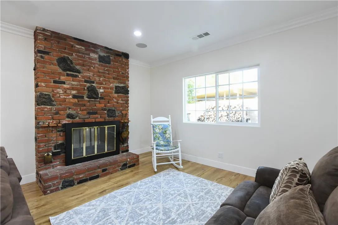 RV Parking! Enjoy brand-new interior paint and a beautifully remodeled kitchen featuring new flooring, shaker-style cabinets, updated counters, inset and overhead lighting, plus a center island and stainless-steel appliances, including gas range/oven, dishwasher, and microwave. A cozy living room offers a welcoming fireplace and an energy-efficient ceiling fan, with an adjacent dining area for easy entertaining. Both bathrooms have been tastefully upgraded with tile flooring, new enclosures, updated fixtures, and modern vanities. The primary bedroom includes wood floors, double closets, a ceiling fan, and a stylish barn door leading to the ensuite bath. Additional bedrooms are generously sized and share the refreshed full hall bath. Central heat and air conditioning and newer windows. French doors open to a covered patio and a spacious, block-walled backyard complete with fruit trees; citrus and avocado plus a horseshoe pit for outdoor fun. 2 Car garage plus the extra-wide concrete driveway and gated RV parking provide excellent convenience and flexibility.