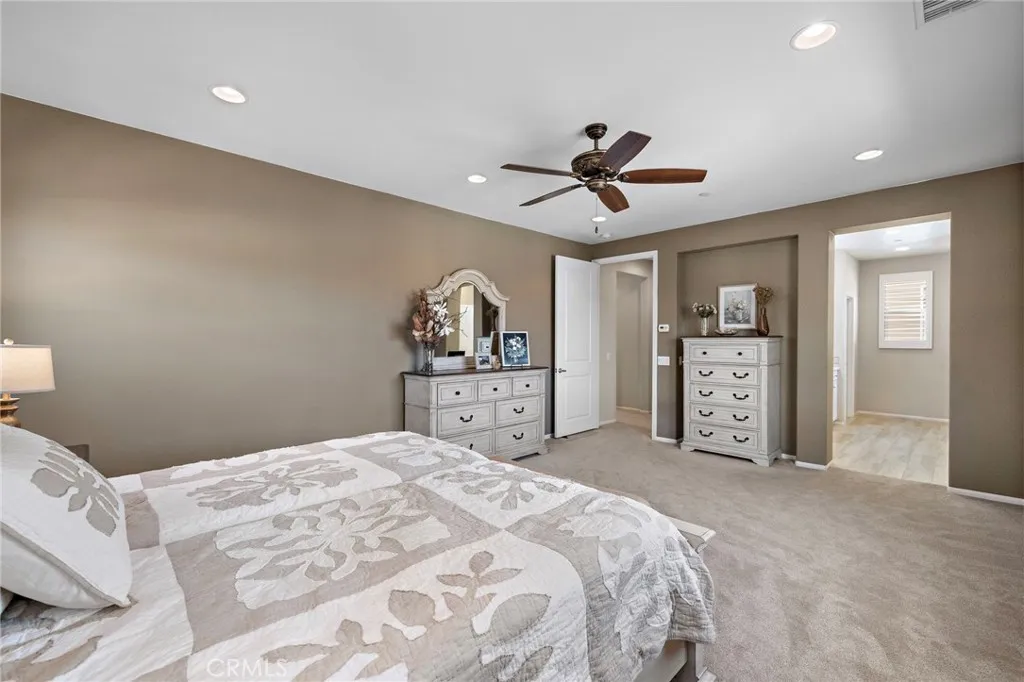 Welcome to 11514 Elderberry, a beautiful move-in ready home in the gated community of Serrano Ridge, located in the Sycamore Creek neighborhood of Corona, CA. This upgraded house sits on a premium cul-de-sac lot with a rare four-car driveway that's unusual find here, where most driveways hold just two cars. The low-maintenance artificial turf gives it immediate curb appeal. Inside, the open-concept layout features a custom Board & Batten entryway with crown molding. Luxury vinyl plank flooring runs throughout the first floor, and 24 recessed lights provide bright, even lighting in every room. The kitchen features extended cabinetry, a full tile backsplash, a touch-activated faucet, and a brand-new stainless steel refrigerator that’s less than six months old. The California room, with a fireplace and ceiling fan, offers seamless indoor-outdoor living that's great for entertaining. This home includes a rare first-floor bedroom and full bathroom, ideal for multigenerational living or guests. It also has a dedicated movie room with custom built-in cabinetry and a desk. The spacious primary suite features mirrored closet doors, a glazed chrome-framed shower, and dual medicine cabinets. Additional upgrades include whole-house interior wall insulation for better soundproofing and energy efficiency, custom wood blinds, rain gutters, pre-wired ceiling fans, and roofline electrical outlets for holiday lighting. Located in the top-rated Corona-Norco Unified School District, this home is within walking distance to Todd Elementary, two community pools, a splash pad, a fitness center, and the 25-acre DeLeo Regional Sports Complex. This complex features baseball diamonds, soccer and lacrosse fields, pickleball and tennis courts, a lighted track, a skate park, a bike park, a dog park, and miles of scenic trails. Enjoy low HOA fees and easy access to freeways, shopping, dining, and just 30 minutes to Orange County beaches.