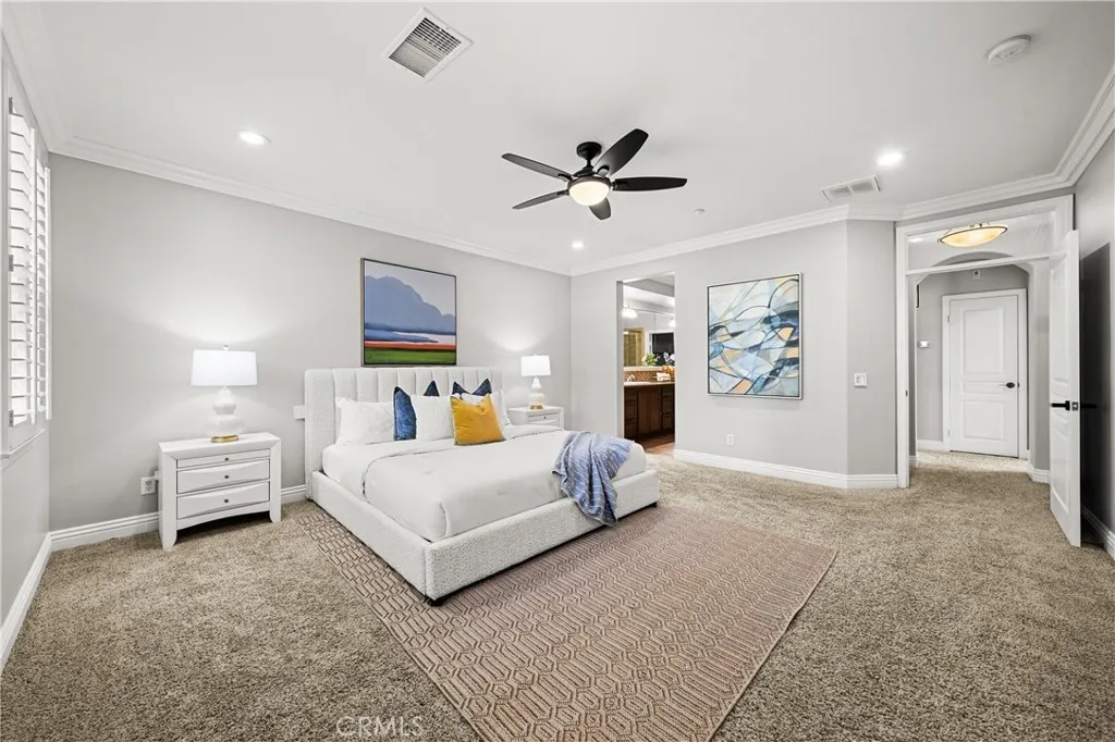 Pristine luxury retreat located in the highly sought-after golf course community of San Lorenzo. This bright and airy home offers 3 bedrooms plus a versatile bonus room, 2.5 bathrooms, and approximately 2,615 sq. ft. of thoughtfully designed living space with an open-concept layout. The inviting living room serves as the heart of the home, highlighted by a beautiful fireplace with a custom-built mantel and entertainment center. The stunning gourmet kitchen features tile backsplash, granite countertops and stainless steel appliances. A convenient breakfast bar is perfect for busy mornings, while a built-in desk provides an ideal workspace. The kitchen seamlessly connects to a covered balcony deck, making outdoor BBQ and entertaining effortless. The formal dining room is enhanced with elegant custom wainscoting and comfortably accommodates gatherings of up to 12 guests. The spacious primary suite features soaring ceilings and an overhead ceiling fan, creating a relaxing private retreat. The luxurious primary bathroom includes a dual vanity, soaking tub, walk-in glass shower, and an oversized walk-in closet. Residents of this community enjoy access to resort-style amenities including a pool, spa, BBQ area, and clubhouse for private gatherings. Ideally located just minutes from Yorba Linda High School, Yorba Linda Town Center, and nearby horse, hiking, and walking trails. This exceptional move-in ready home offers comfort, style, and convenience—an opportunity you won’t want to miss.