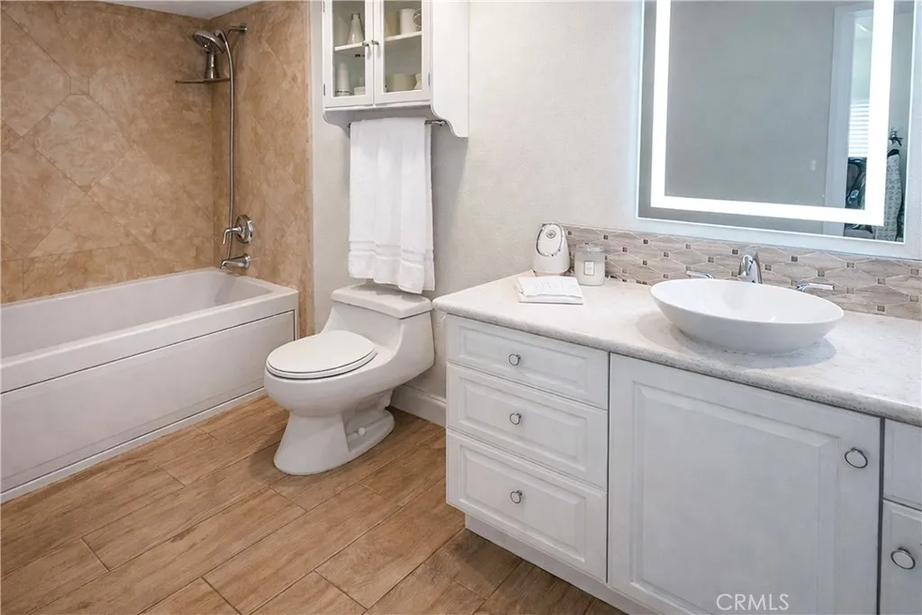 THIS REMODELED, RARE END-UNIT WITH NO NEIGHBORS ABOVE OR BELOW OFFERS A UNIQUE BLEND OF PRIVACY, NATURAL LIGHT, AND MODERN UPGRADES IN THE HIGHLY DESIRABLE DEL PRADO COMMUNITY. Ideally positioned within the neighborhood, this beautifully remodeled 1-bedroom, 1-bath residence enjoys abundant windows that fill the home with natural light, creating a bright and welcoming atmosphere that complements the soaring ceilings and open-concept living spaces. The living room also opens to a private balcony, offering a comfortable outdoor retreat perfect for relaxing or enjoying fresh air. Thoughtfully renovated with quality craftsmanship, the home features all-new flooring and dual-pane windows, enhancing both comfort and energy efficiency. The redesigned kitchen is a standout, combining elegance and functionality with upgraded cabinetry featuring a built-in spice drawer, Lazy Susan, and self-closing drawers, complemented by stunning quartz countertops, upgraded stainless steel appliances—including the refrigerator—and a sleek modern exhaust hood. The fully remodeled bathroom offers a spa-inspired retreat, highlighted by a newly installed JACUZZI TUB, a stylish vanity cabinet with quartz countertop, and a modern LED mirror. The spacious primary bedroom showcases high ceilings, crown molding, and a walk-in closet with custom built-ins, providing both style and practical organization. Significant system upgrades include a new TWO-STAGE A/C System and new heating unit, delivering year-round comfort and long-term peace of mind. Additional improvements include plantation shutters throughout and a finished GARAGE with DIRECT ACCESS, epoxy flooring, built-in cabinetry, and overhead storage, maximizing both functionality and presentation. Del Prado is one of the area's most sought-after communities, valued for its prime location, well-maintained amenities, and a relaxing walk to shopping, dining, and theatre, as well as a five minute drive to major commuter routes. With ONLY ONE HOA, monthly dues conveniently INCLUDE WATER AND TRASH services, adding both simplicity and value. This move-in ready home presents a rare opportunity to enjoy privacy, modern upgrades, and refined living in one of the community’s most desirable settings.