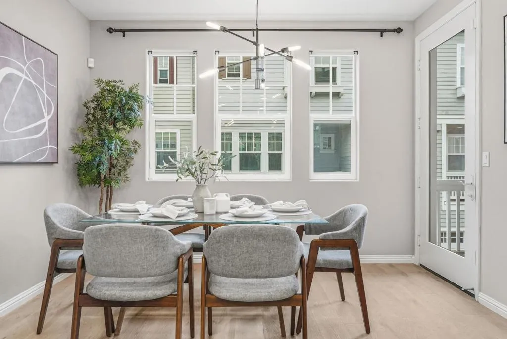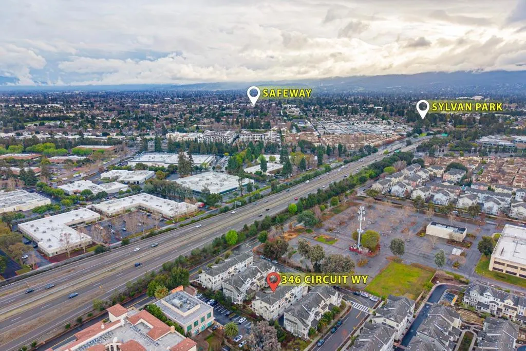 Welcome to this charming 2018-built townhome with three suites in the sought-after Radius at Whisman Station community. A covered front porch welcomes you inside to a ground-floor front-facing suite with an en-suite bathroom featuring a quartz countertop and shower-over-tub. The second level offers an open, light-filled floor plan with a front-facing living room flowing into a modern kitchen with a large island and breakfast bar, highlighted by stylish pendant lighting. The gourmet kitchen has quartz countertops, stainless steel appliances, and ample white cabinetry. An adjacent dining area with elegant lighting opens to a private balcony. A half bathroom completes this level. The third floor has two suites: the primary with a spacious bedroom, pendant light, en-suite bathroom with double vanity, stall shower, and walk-in closet, and another large suite across the hall with an en-suite bathroom with quartz countertop and shower-over-tub. Upper-level laundry with washer and dryer adds convenience. The home includes an attached two-car garage, is close to Pyramid Park, and is near Highways 237, 101, 85, Central Expressway, Downtown Mountain View, Caltrain, Light Rail, and major tech companies. Do not miss this great opportunity!