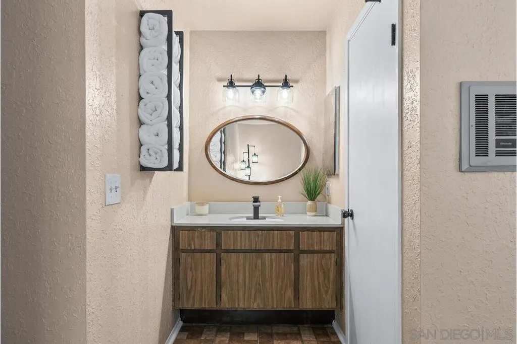 Scripps Ranch 92131 – lowest priced homeownership opportunity! First-floor condo with both a balcony and patio. Clean and move-in ready with a fireplace in the living room and a new walk-in shower. Newer stainless steel kitchen appliances. Spacious and bright. Freeway convenient yet surrounded by eucalyptus trees, giving the complex a quiet, peaceful feel. A beautiful community pool and laundry room are located just across the driveway from the unit. Pets allowed with very few restrictions. One covered parking space included. Sellers currently lease a second space from the HOA for $50 per month, which may be transferable to the buyer.