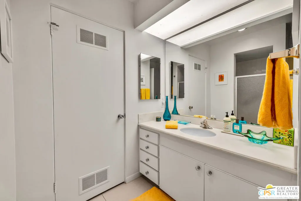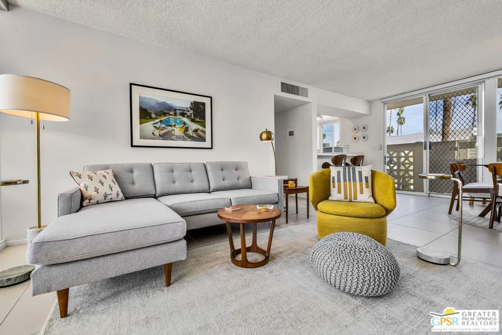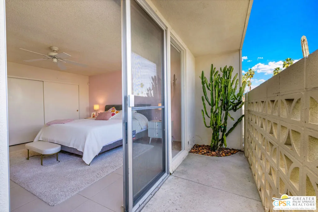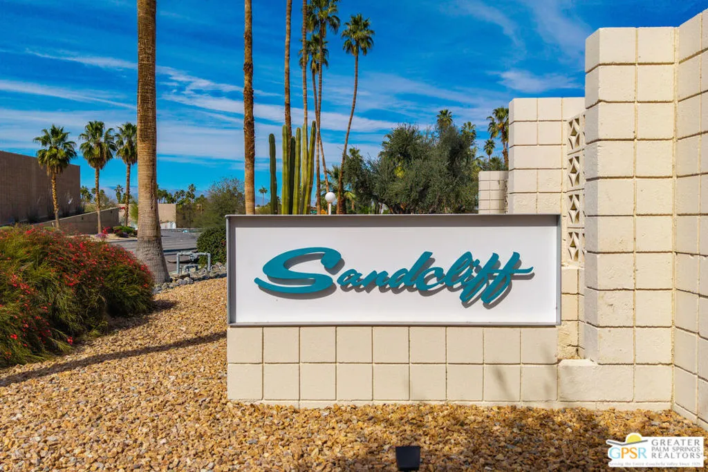 Iconic mid-century architecture. Spectacular mountain views. Historic distinction. Welcome to Sandcliff! Located within a designated Palm Springs Historic District, Sandcliff was recently added to the National Register of Historic Places, becoming the first multi-family development in Palm Springs to receive this recognition. This beautifully maintained home has been thoughtfully updated for desert modern living. Designed by architect Sherwin L. Barton and celebrated for its signature pinwheel layout, decorative concrete screen block, and walls of glass, Sandcliff represents one of Palm Springs' most architecturally significant mid-century garden apartment communities. This residence honors that legacy while incorporating meaningful modern enhancements. Sandcliff currently participates in The Mills Act, offering potential property tax advantages for eligible owners (subject to regulatory approval). Expansive living and dining areas open to private patios with impressive mountain views, creating seamless indoor-outdoor flow. Motorized roller shades throughout provide everyday convenience while preserving clean architectural lines. Dual-pane tempered glass upgrades in the living and dining areas enhance comfort and efficiency. Both bathrooms have been refreshed with updated fixtures and an interior laundry room a rare amenity in many mid-century communities adds everyday practicality. The original poured terrazzo primary patio has been enhanced with new drip irrigation lines, curated cactus and succulent plantings, landscape lighting on dusk-to-dawn timers, and a custom wrought iron gate, creating an inviting outdoor retreat. A convenient car port and private storage unit are located directly adjacent to the residence. Two heated pools and spas, walkable access to nearby shopping and dining, and breathtaking mountain views complete the experience. Experience Sandcliff: Authentic architecture. Thoughtful updates. Historic pedigree - the quintessential Palm Springs lifestyle as it was meant to be.