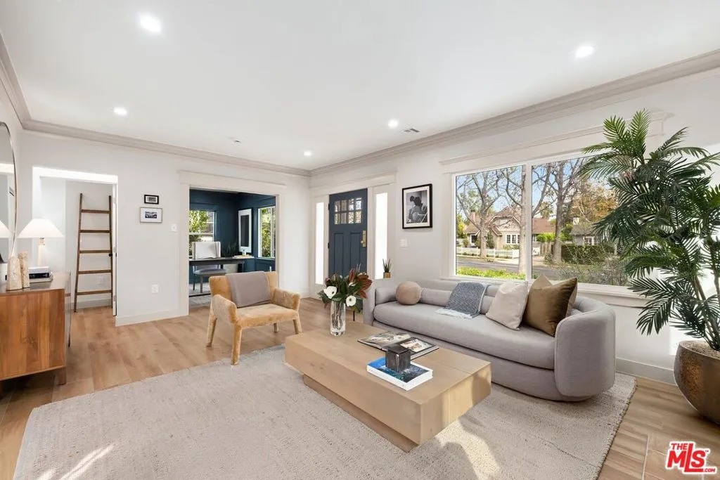 Originally built in a classic architectural era and now fully reimagined, this meticulously remodeled Spaulding Square residence offers a refined, current interpretation of timeless Los Angeles living. Positioned on a wide stretch of North Orange Grove, the home sits within one of the city's most coveted historic enclaves, just moments from West Hollywood, Sunset Boulevard, and an endless array of dining, shopping, and entertainment destinations. The thoughtfully designed floor plan balances formal and relaxed living. A mantle-anchored living room sets a sophisticated tone, flowing seamlessly into a formal dining room where French doors open directly to a private patio, creating an easy indoor-outdoor flow. The chef's kitchen has been completely rebuilt with premium appliances and a generous center island, designed for both everyday function and elevated entertaining. Three bedrooms each feature their own ensuite bath, offering comfort and privacy, while a well-appointed powder room serves guests. A spacious office with built-ins provides flexible space for work or retreat as a family den or a 4th bedroom. Side-by-side laundry enhances convenience without sacrificing space or flow. Extensive upgrades bring modern performance to this classic home, including a new roof, new HVAC system, new plumbing and electrical, and all-new landscaping. The finished one-car garage presents prime potential for an ADU conversion, complemented by additional on-site parking for multiple vehicles. Set on a large, grassy oversized lot, the property offers space to relax, entertain, or expand. An expansive front porch overlooks one of Spaulding Square's most picturesque tree-lined streets, reinforcing the neighborhood's rare sense of community. Often described by residents as an oasis within the city, Spaulding Square is known for its succession of exceptionally charming homes and its vibrant street life, where neighbors gather and stroll in the early evening light. This offering presents a rare opportunity to move into a comprehensively renovated home in one of Los Angeles' most treasured and tightly held neighborhoods.