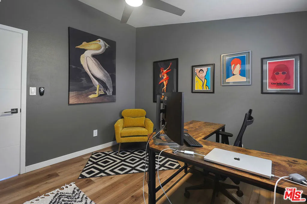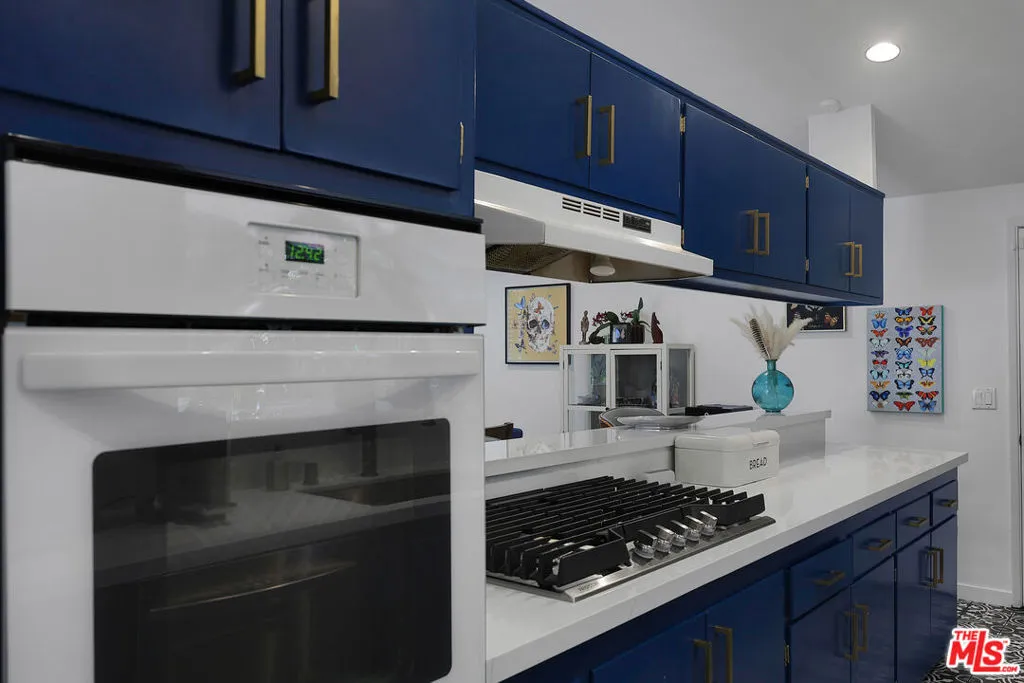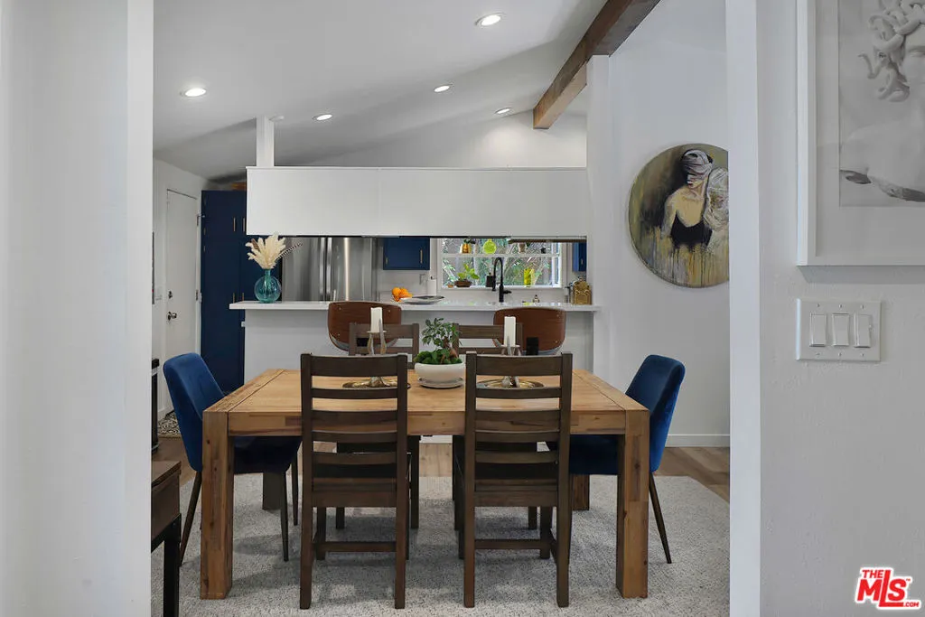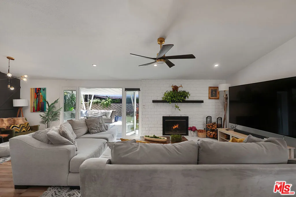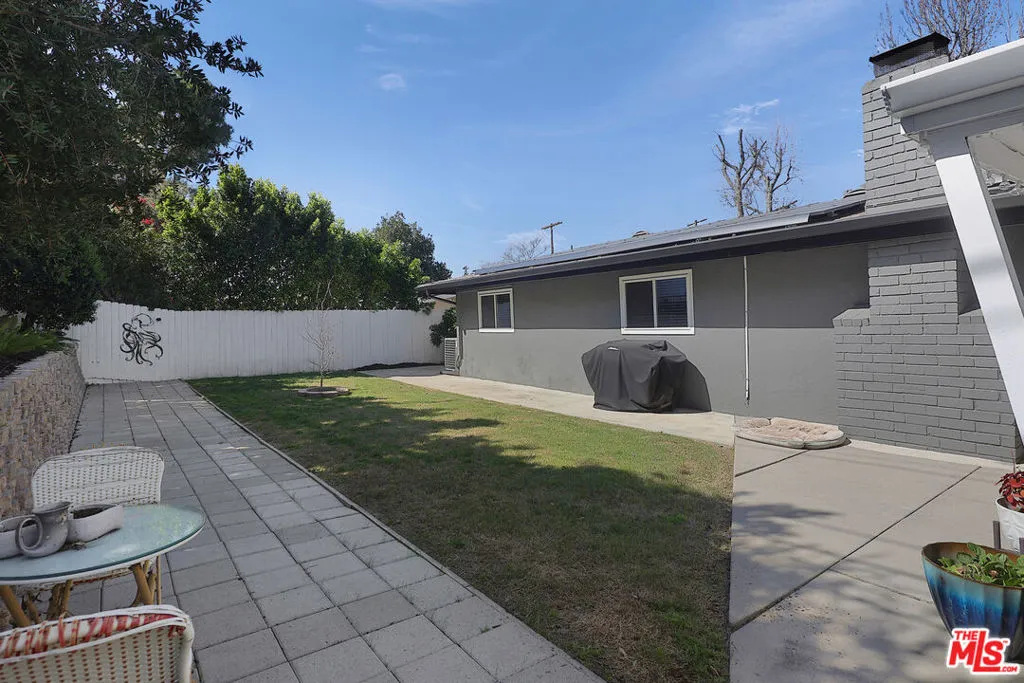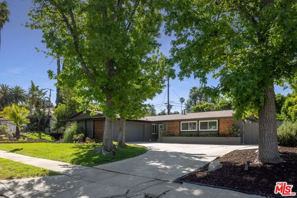 Classic mid century architecture meets modern comfort in this beautifully updated 3 bed, 2 bath home located in the highly sought after Carlton Terrace neighborhood of Woodland Hills. With 1,404 sq ft of thoughtfully designed living space, this residence offers excellent curb appeal with well maintained landscaping, mature trees, brick accents, and an upgraded sprinkler system. Leased solar panels help reduce monthly power costs, adding valuable energy efficiency. Inside, the remodeled interior blends timeless mid century lines with a fresh, contemporary aesthetic. A formal entry opens to an airy, open plan living and dining area featuring engineered wood flooring, recessed lighting, smooth ceilings, and distinct architectural touches including a white accent wall, tall windows, and a classic brick fireplace. French doors flood the space with natural light and lead to the inviting backyard. The galley style kitchen offers plenty of cabinetry, modern hardware, floral pattern tile, and built in appliances balancing style and function while maintaining the home's clean, modern design. Down the hall, the primary suite features high ceilings, a walk in closet, and a fully remodeled en suite bath. Two additional bedrooms share a beautifully updated full hall bath with sleek cabinetry, new flooring, and designer tilework. Major system upgrades include dual pane windows, LED lighting, updated electrical, replaced HVAC, and a new sewer line. Designer baseboard lighting adds a subtle, modern glow throughout. An oversized attached garage provides abundant storage and a dedicated laundry area. The backyard is ideal for relaxation or play, featuring a covered patio and generous lawn space. All of this is moments from Woodland Hills Academy, Westfield Topanga, The Village, Trader Joe's, Target, Ventura Blvd, and the Warner Center, with easy access to freeways, shopping, dining, and entertainment.