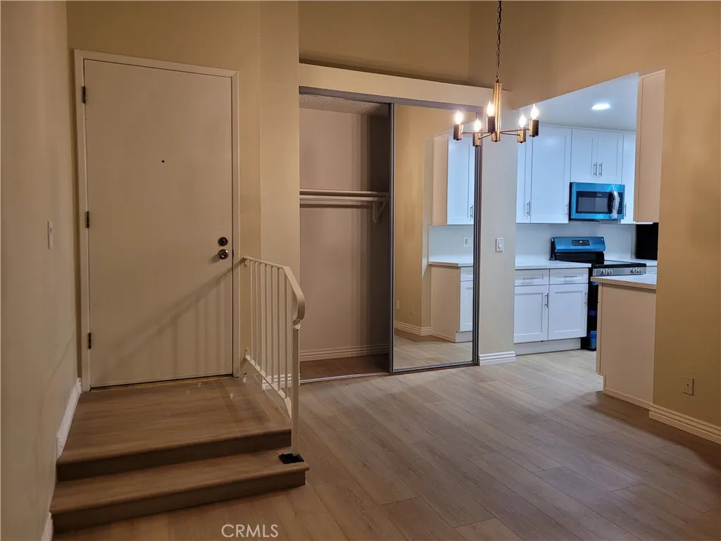 Top-floor (Unit 306) 1-bedroom Lindenwood condominium located in the highly desirable Bixby Knolls neighborhood. This light-filled home features soaring ceilings in both the living room and bedroom, creating an open and airy atmosphere. The updated kitchen is beautifully appointed with recessed lighting, quartz countertops and backsplash, stainless steel appliances, and crisp white shaker cabinetry. New vinyl flooring runs throughout the unit, adding a modern and cohesive touch. Two spacious closets provide generous storage. Enjoy your private balcony overlooking the serene, landscaped interior courtyard — a perfect setting for morning coffee or evening relaxation. Conveniently situated just steps from the elevator, trash chute, and community laundry room. The unit includes one secured ground-level parking space. Lindenwood residents enjoy a variety of well maintained amenities including two elevators, a recreation room, sparkling pool and spa, BBQ area, and lushly landscaped courtyard.