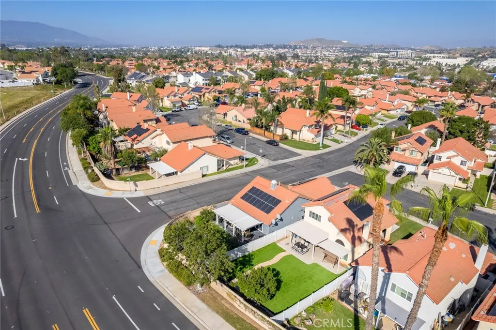 Located on a cul-de-sac, this beautiful home offers a desirable floor plan, scenic hill views, and access to fantastic community amenities in a location convenient to both Riverside and Corona. Step inside to a bright and welcoming formal living room with soaring vaulted ceilings and a cozy fireplace, creating a warm and inviting gathering space filled with natural light. The living room flows seamlessly into the dining area and a beautifully updated kitchen designed for both style and functionality. The remodeled kitchen is a standout feature, showcasing newer cabinetry, stainless steel appliances, recessed lighting, custom fixtures, and a large farmhouse-style sink positioned beneath the window. A convenient center island with breakfast bar seating provides additional prep space and casual dining, making this kitchen perfect for everyday living and entertaining. Just off the kitchen is a separate family room/den, offering flexible living space ideal for a media room, home office, or playroom. French doors open from the dining area to the backyard, creating wonderful indoor-outdoor living. The spacious yard features artificial turf, a large covered patio and beautiful views of the surrounding hills, providing the perfect setting for relaxing evenings, weekend barbecues, and outdoor gatherings. With plenty of space for play, gardening, or entertaining, this backyard is designed to be enjoyed. All three bedrooms are located upstairs, offering privacy from the main living areas. The primary bedroom is positioned at one end of the hallway, while the two additional bedrooms are located at the opposite end, creating a comfortable and functional layout. Additional highlights include ceiling fans throughout, leased solar panels for energy efficiency, and an owned water softener system. Residents of this community enjoy access to resort-style HOA amenities including a pool, spa, picnic areas, barbecue facilities, and tennis courts, enhancing the lifestyle this neighborhood offers. Ideally situated near the Riverside/Corona border with convenient access to the 91 Freeway, this home offers an excellent location for commuters while still enjoying the comfort of a neighborhood setting. With its cul-de-sac location, updated kitchen, newer roof, vaulted ceilings, flexible living spaces, water filtration system, and scenic backyard views, this home presents a wonderful opportunity in one of Riverside’s desirable communities.
