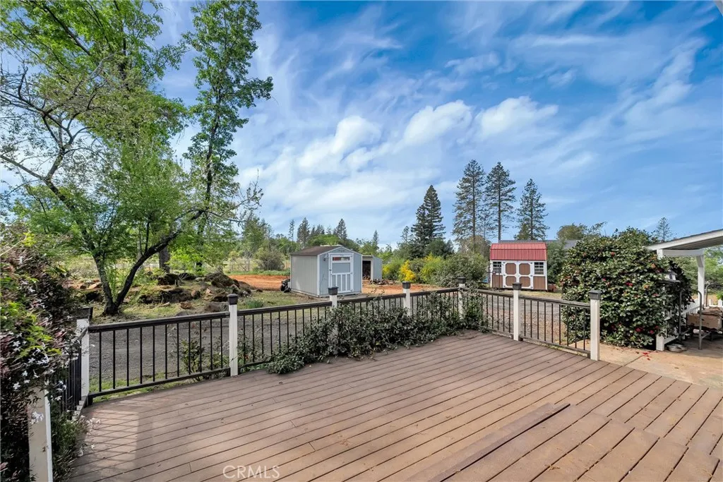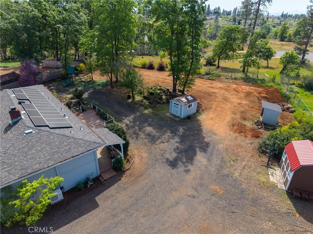 Welcome to your own slice of Paradise! This charming 1950s home blends vintage character with modern upgrades, offering a warm and inviting retreat on a private lane. Featuring 3 bedrooms, 2 bathrooms, and 1,612 square feet of living space, the home sits on a spacious 0.81-acre lot. Inside, you'll find original hardwood floors that have been beautifully refinished, complemented by new carpet, fresh paint, and a renovated kitchen. The home is equipped with 18 owned solar panels, a whole-house water filtration system, and a mini-split HVAC system installed in 2018. The roof was replaced in 2017, ensuring peace of mind for years to come. Step outside to enjoy breathtaking sunset views from the expansive deck, perfect for entertaining. A covered BBQ area makes year-round grilling a breeze. The property also includes a 900 sq ft insulated detached garage/shop with 50amp service and 220v, ideal for hobbyists or DIY enthusiasts. Two detached sheds provide ample storage, and the fully fenced yard with an electric gate offers privacy and security. Located close to Starbucks, restaurants, shopping, and just a short drive to Chico, this home offers both tranquility and convenience. Come experience the charm and character of this lovingly maintained Paradise gem.